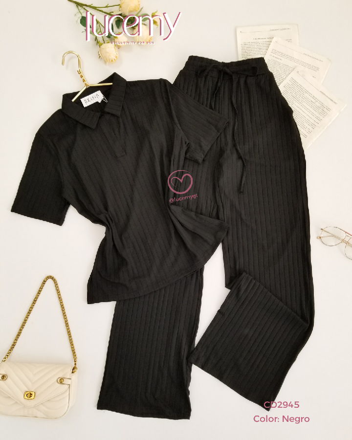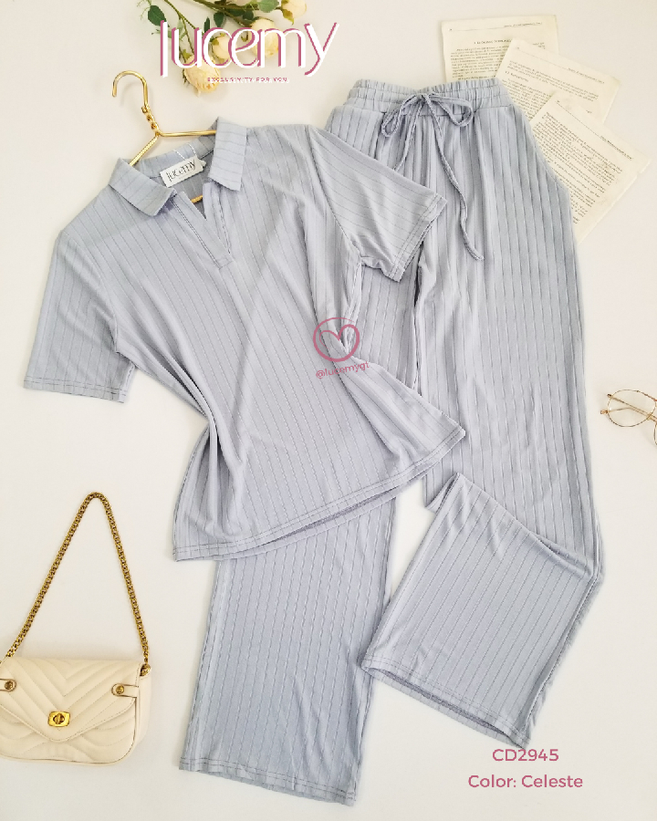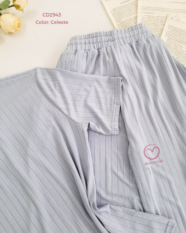 Descripción: Bello conjunto, cuello camisero, manga corta, pantalón con elástico en ala cintura, cinta ajustable, bolsillos a los lados tela s