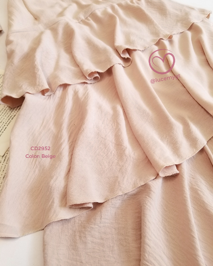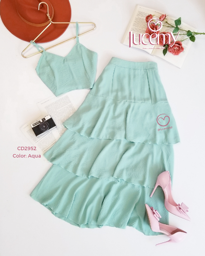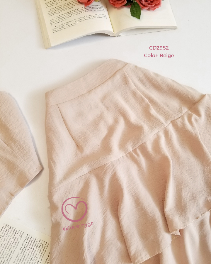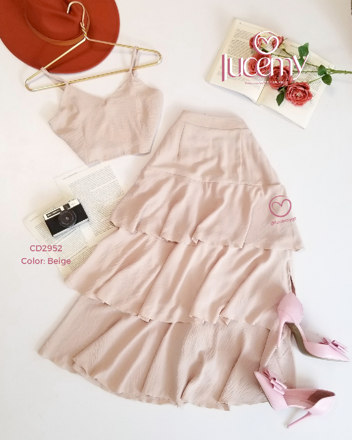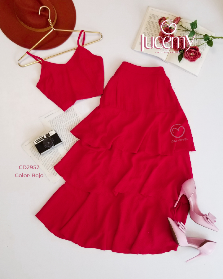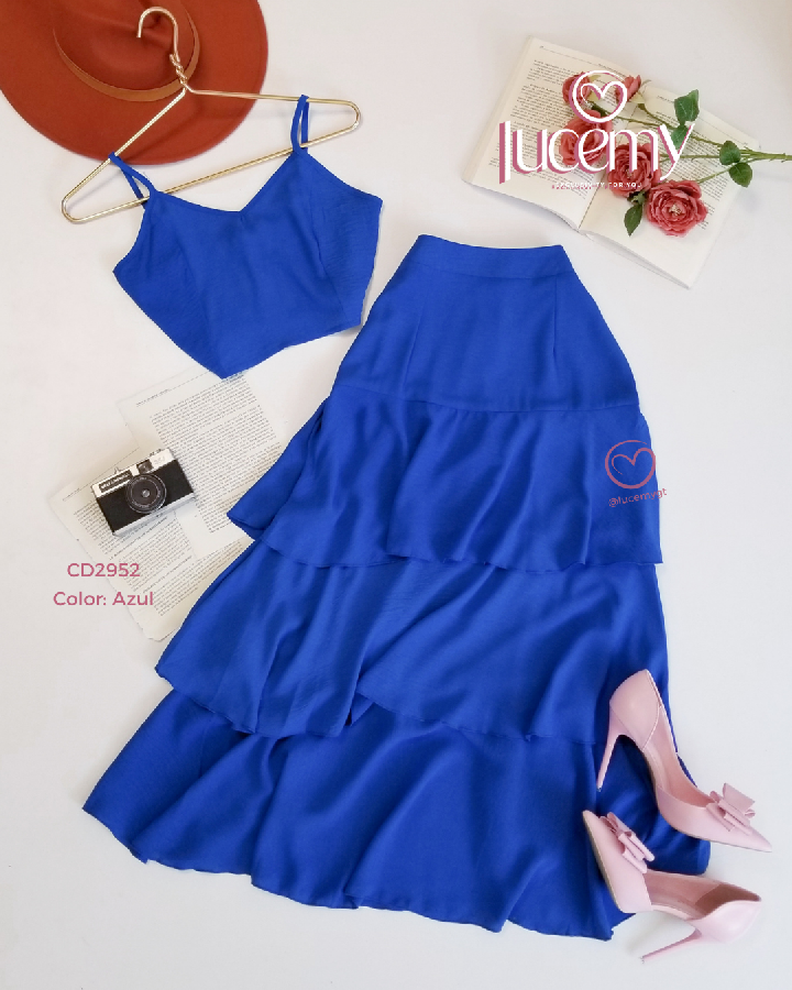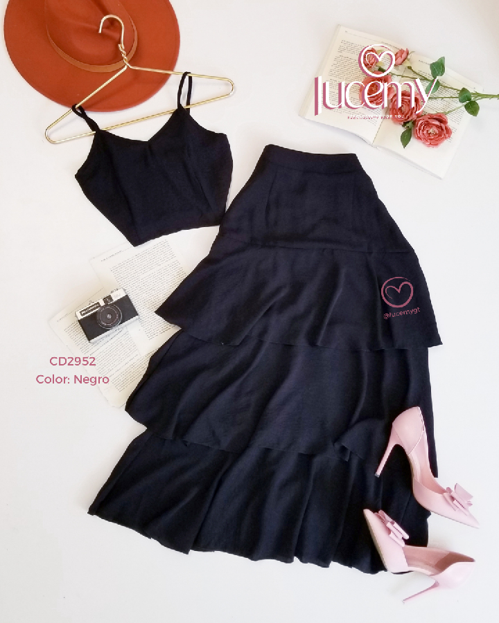 Descripción: Blusa de tirantes ajustables, escote corazón, fruncido en la parte de atrás, falda de tiempos, con cremallera al lado, elástico en la parte de la cintura.