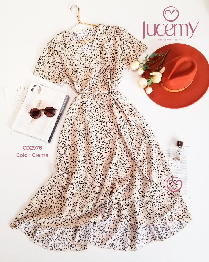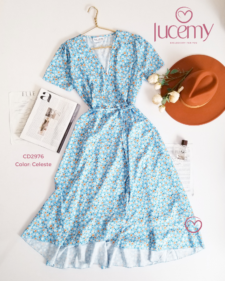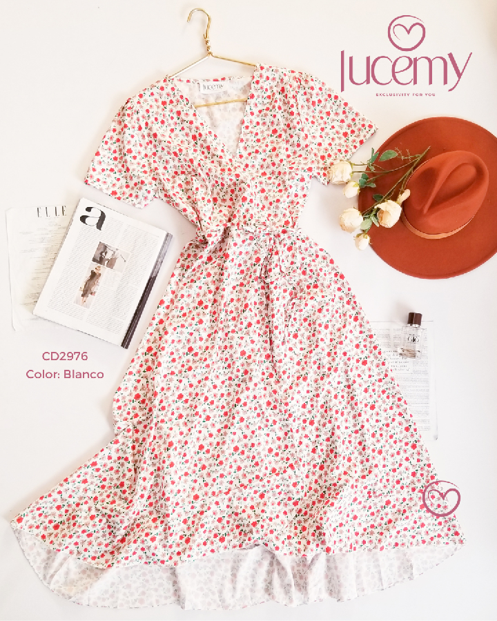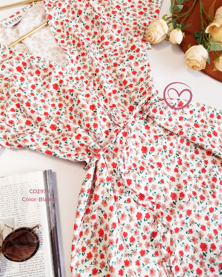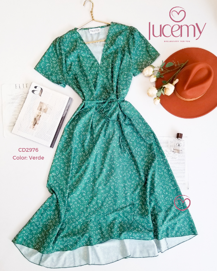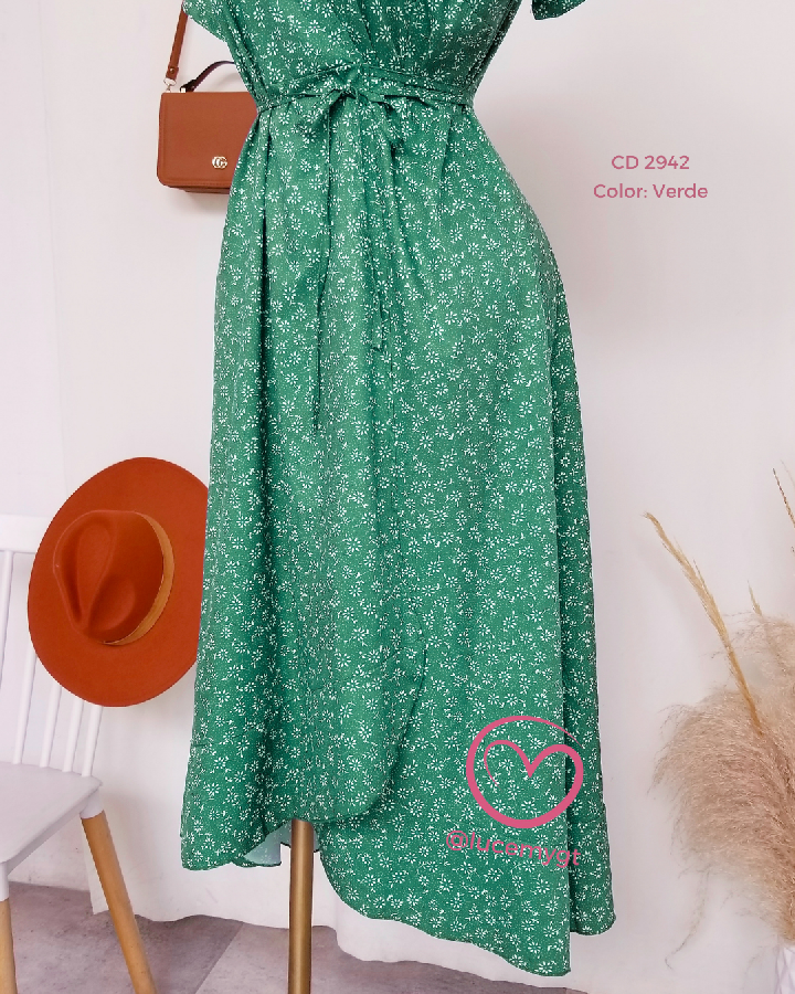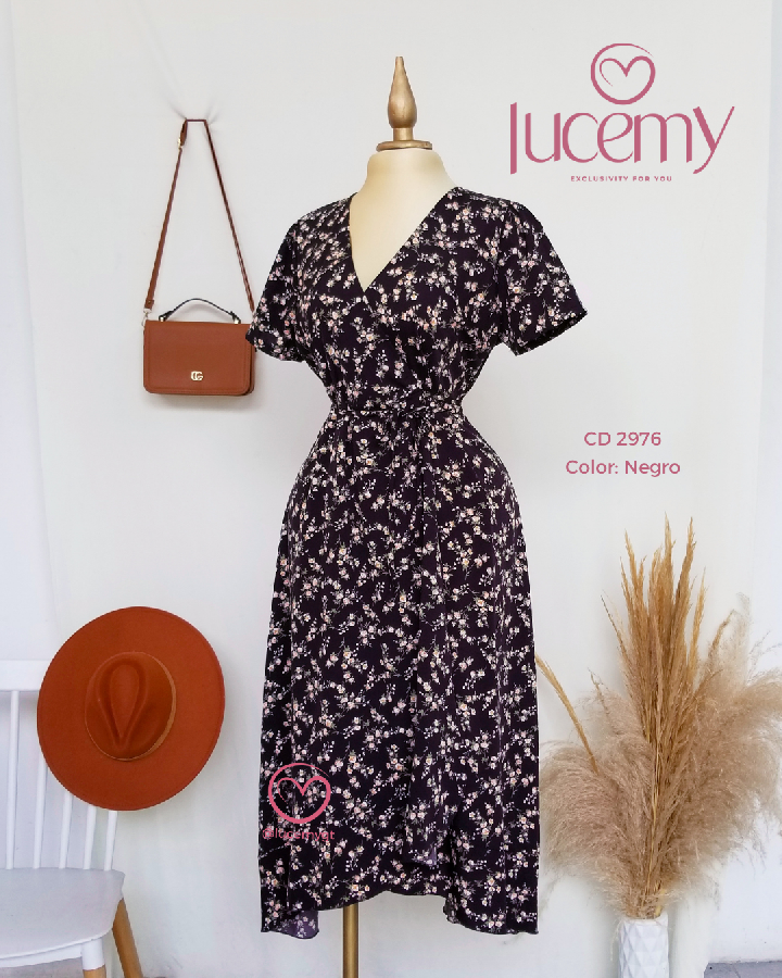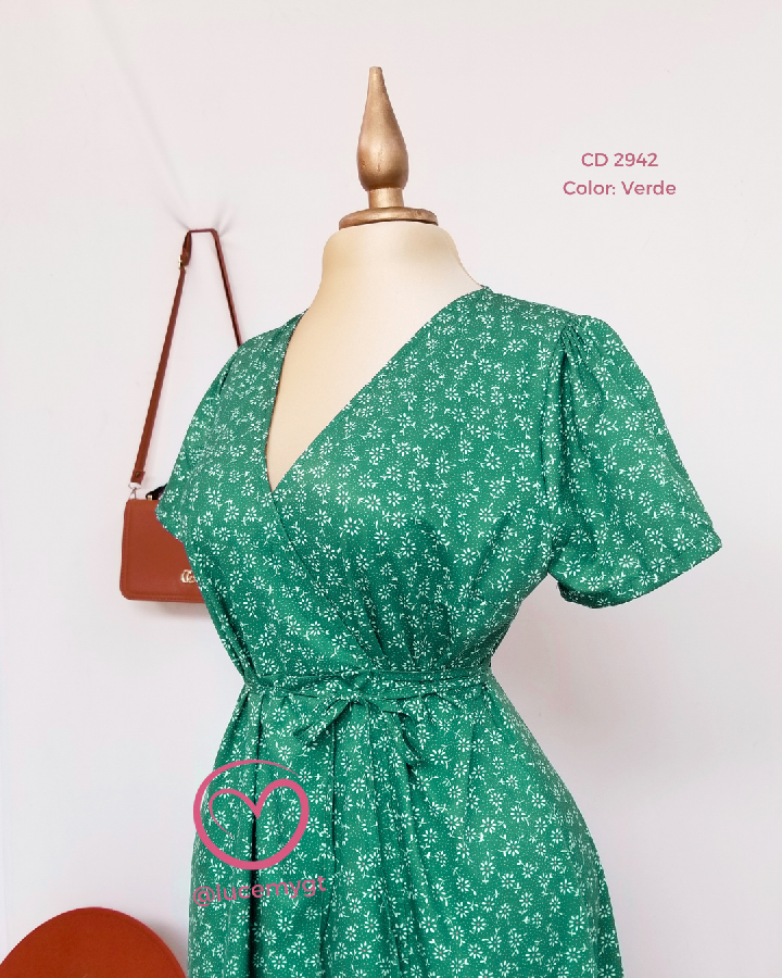 Descripción: Vestido Flora, escote v, manga corta, traslapado.