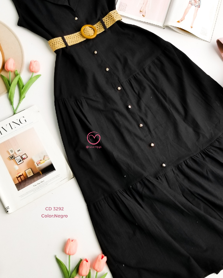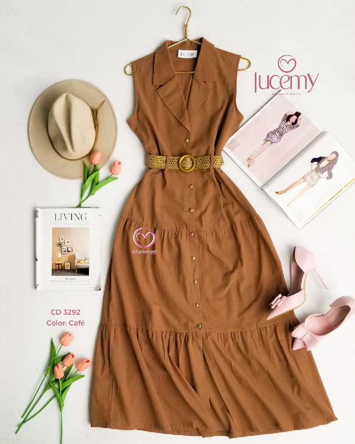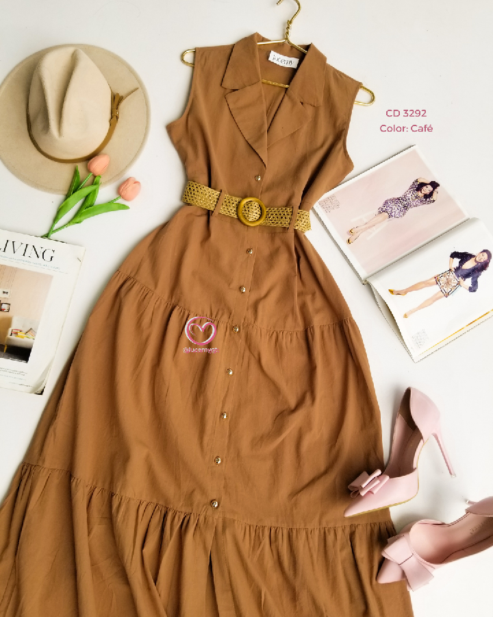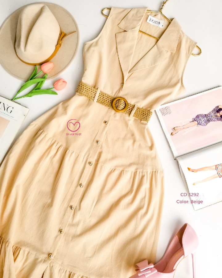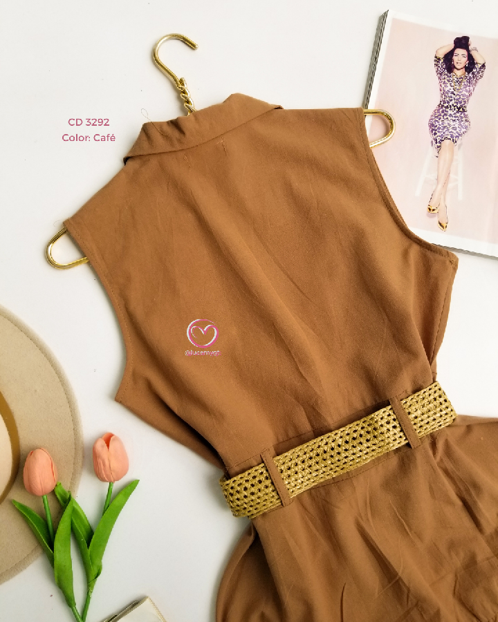 Descripción: cuello camisero, sin mangas, botones en la parte enfrente, cincho para ajustar a la cintura.