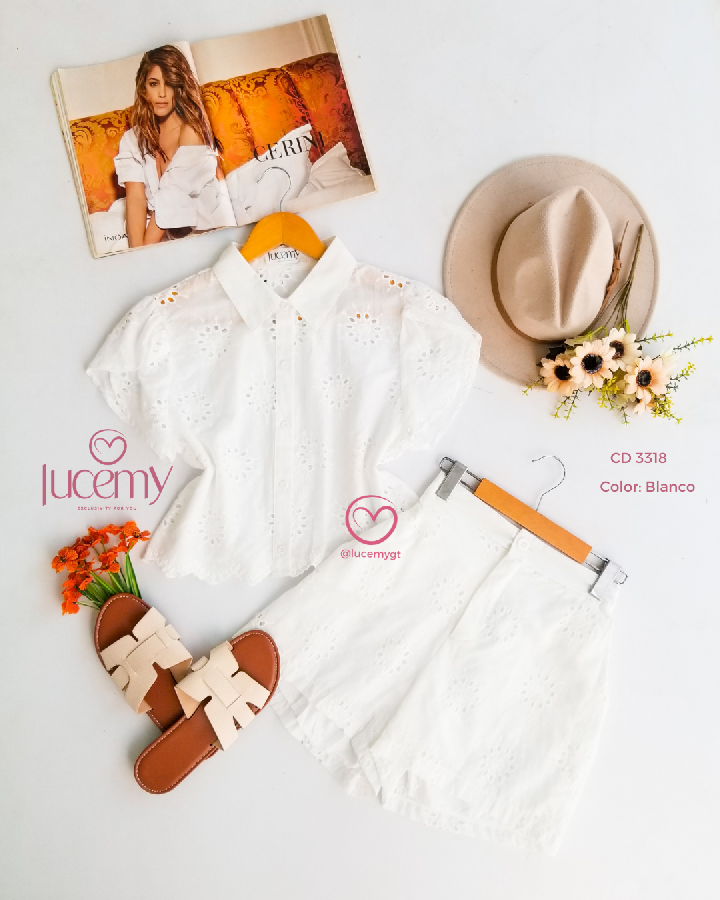 Descripción: Blusa de manga corta con cuello tipo camisero y botones al frente. Su diseño en tela bordada tipo calado aporta un toque romántico y femenino, mientras que su corte ligeramente suelto brinda comodidad y frescura. Short de cintura alta confeccionado en la misma tela bordada, con diseño cómodo y favorecedor.