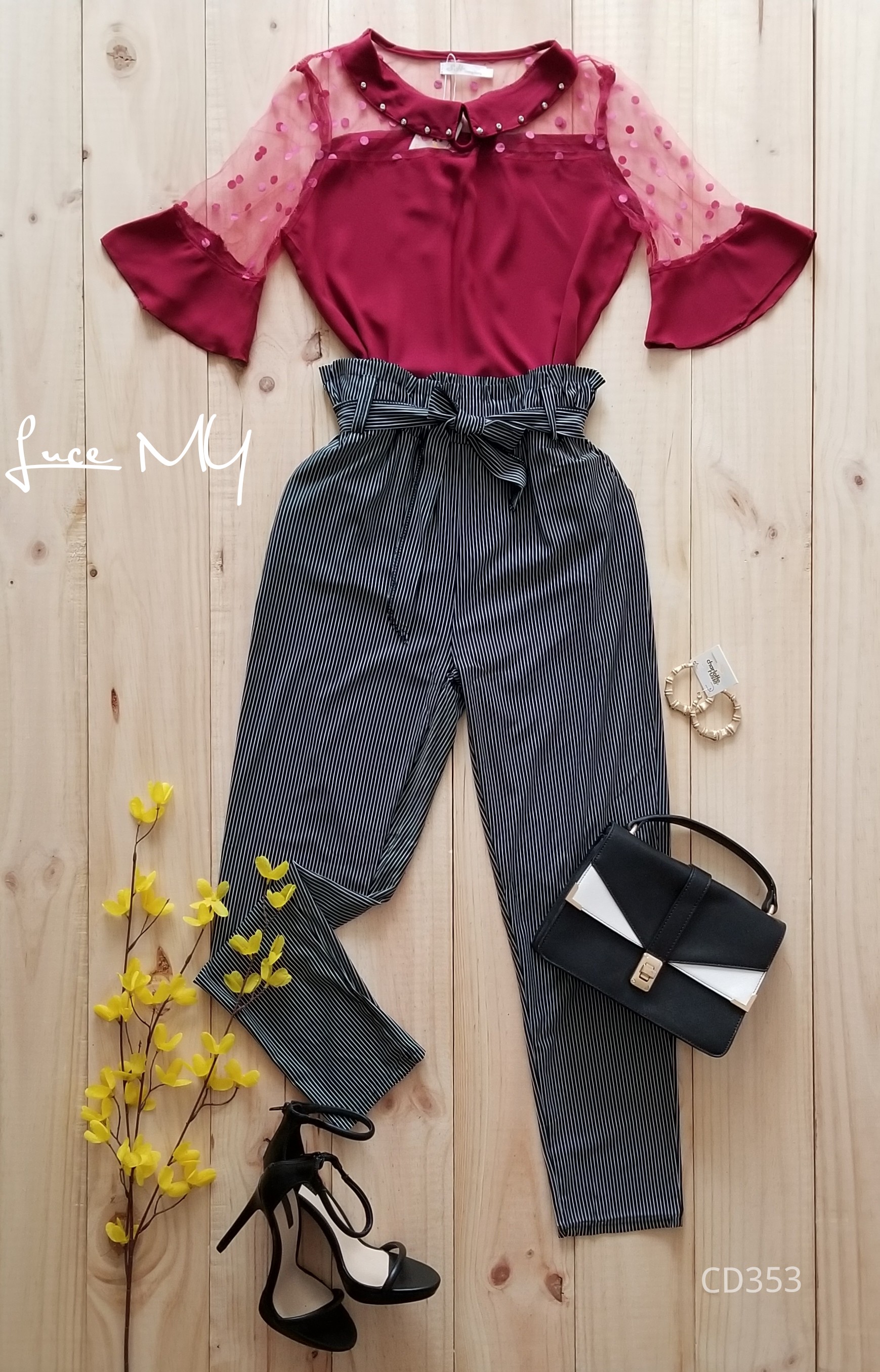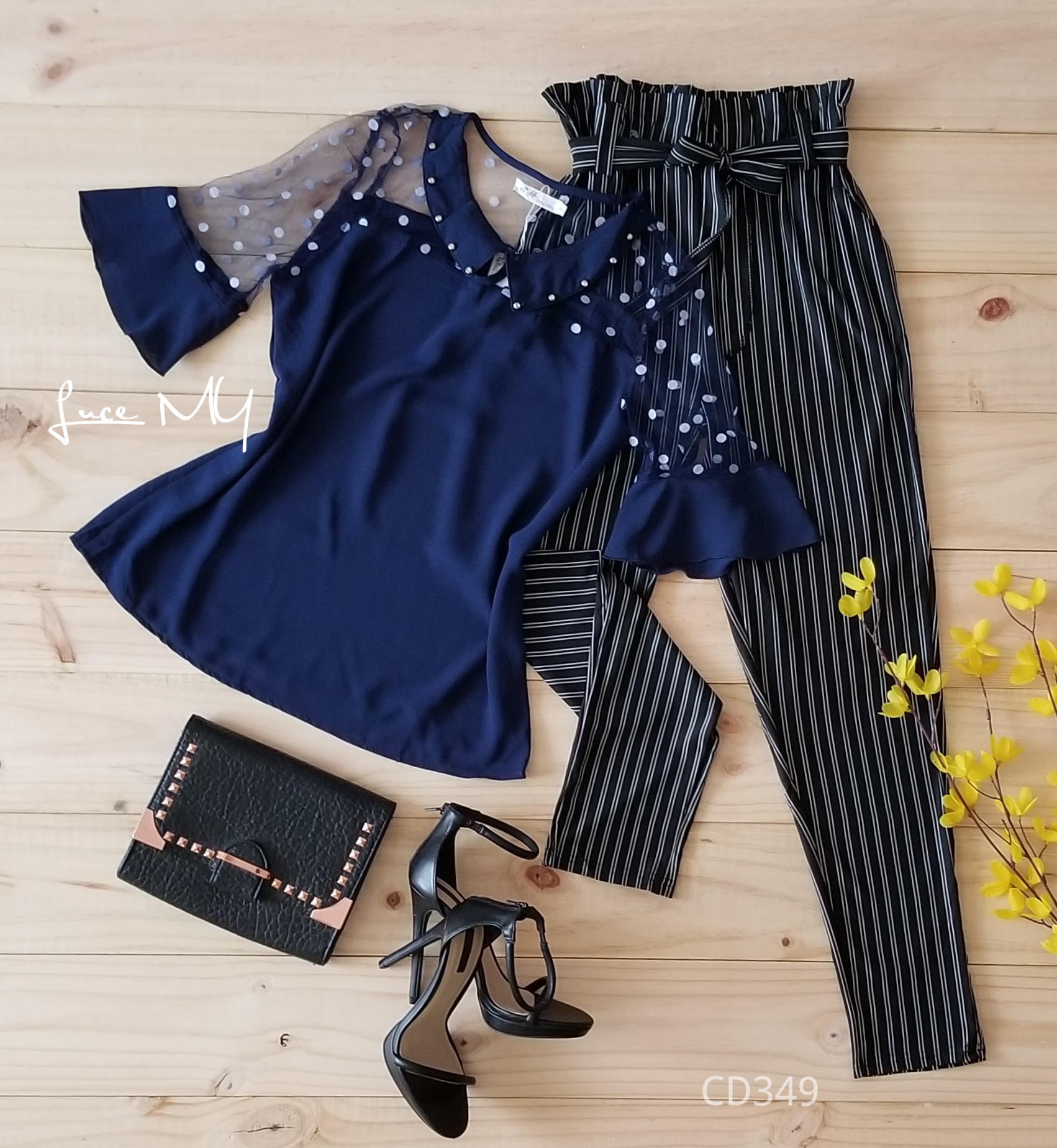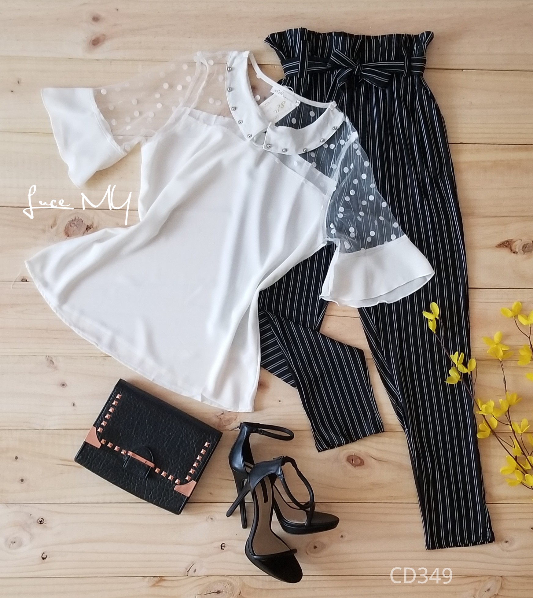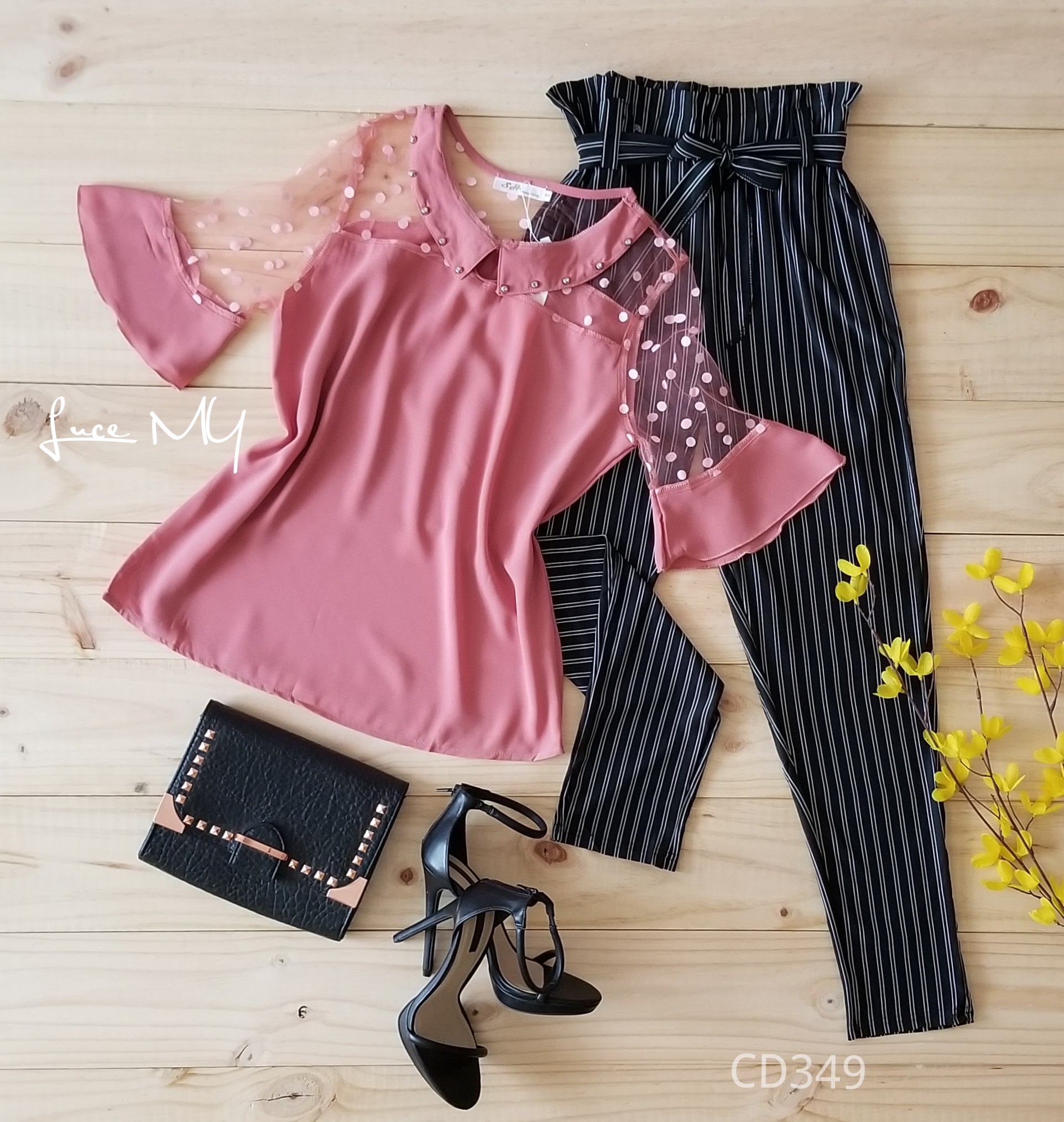 Descripción: Blusa Ilusión con puntos, manga 3/4, con un botón en el cuello en la parte de enfrente. pantalón de líneas tela poliéster 90% y Spandex 10% Promoción Si llevas dos outfits a Q200.00