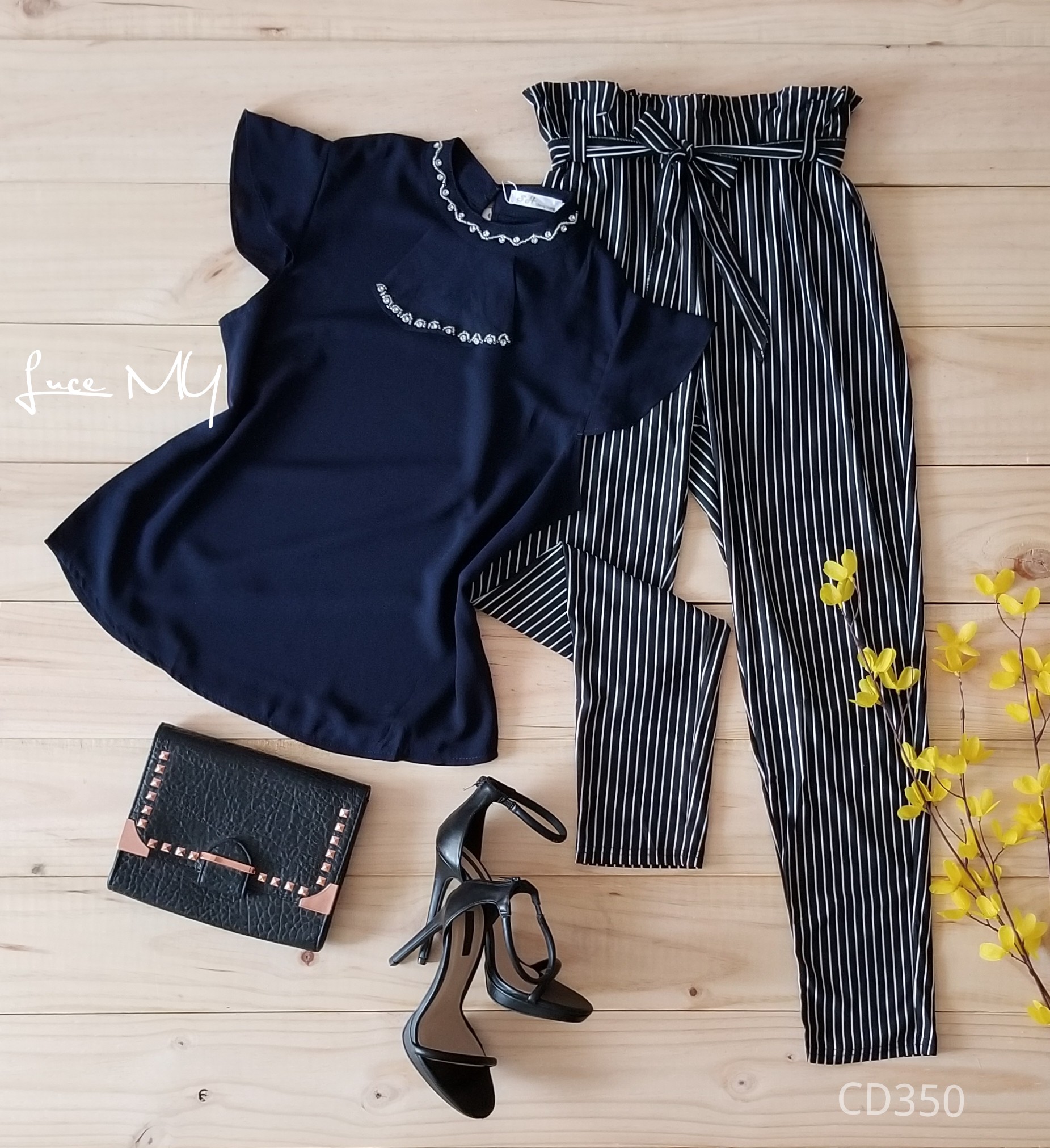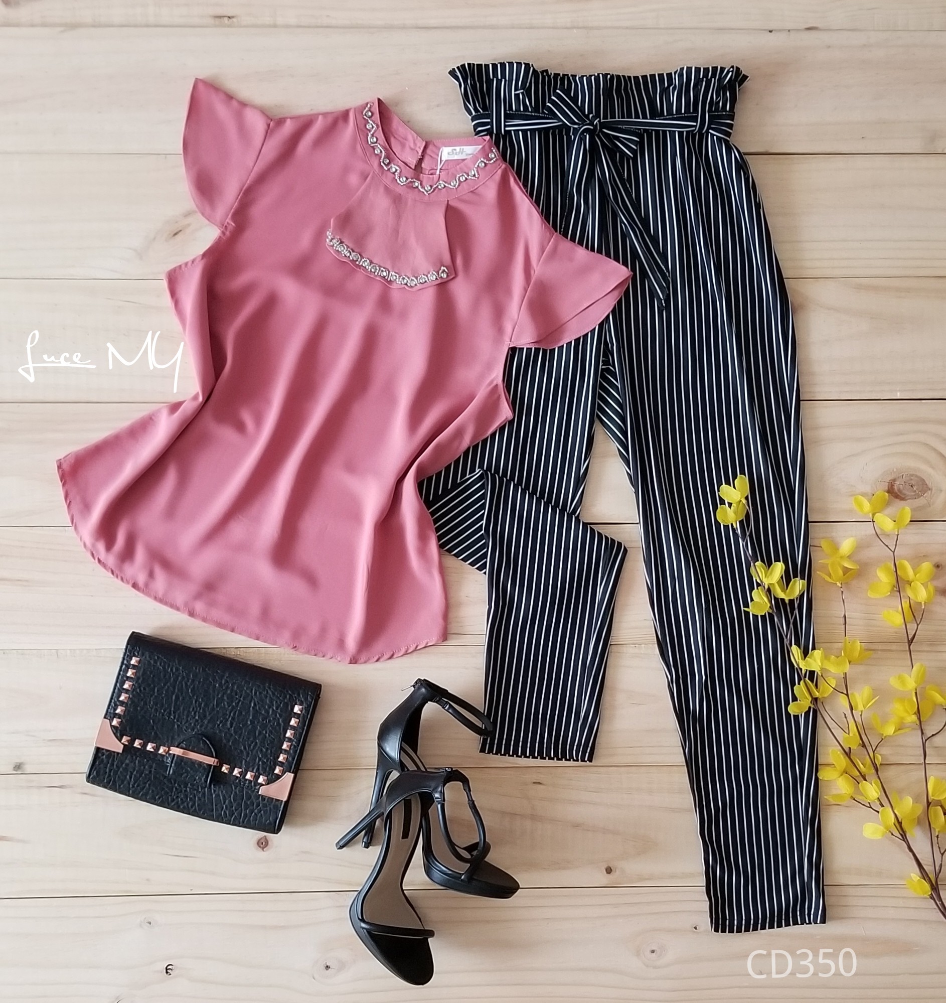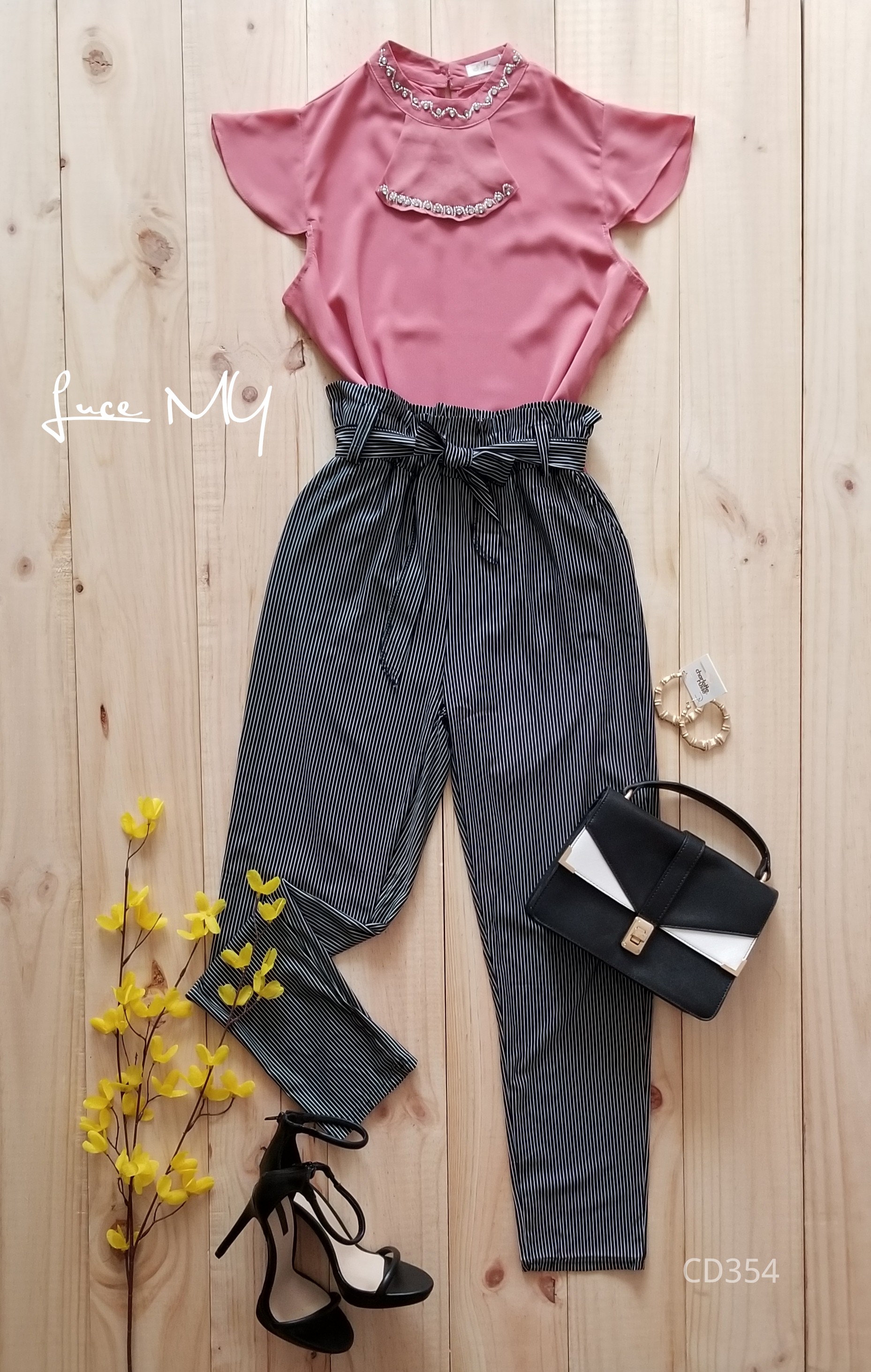 Descripción: Blusa Cuello Jabot, manga corta tiene un botón en la parte de atrás del cuello. pantalón de líneas tela poliéster 90% y Spandex 10% Promoción Si llevas dos outfits a Q200.00
