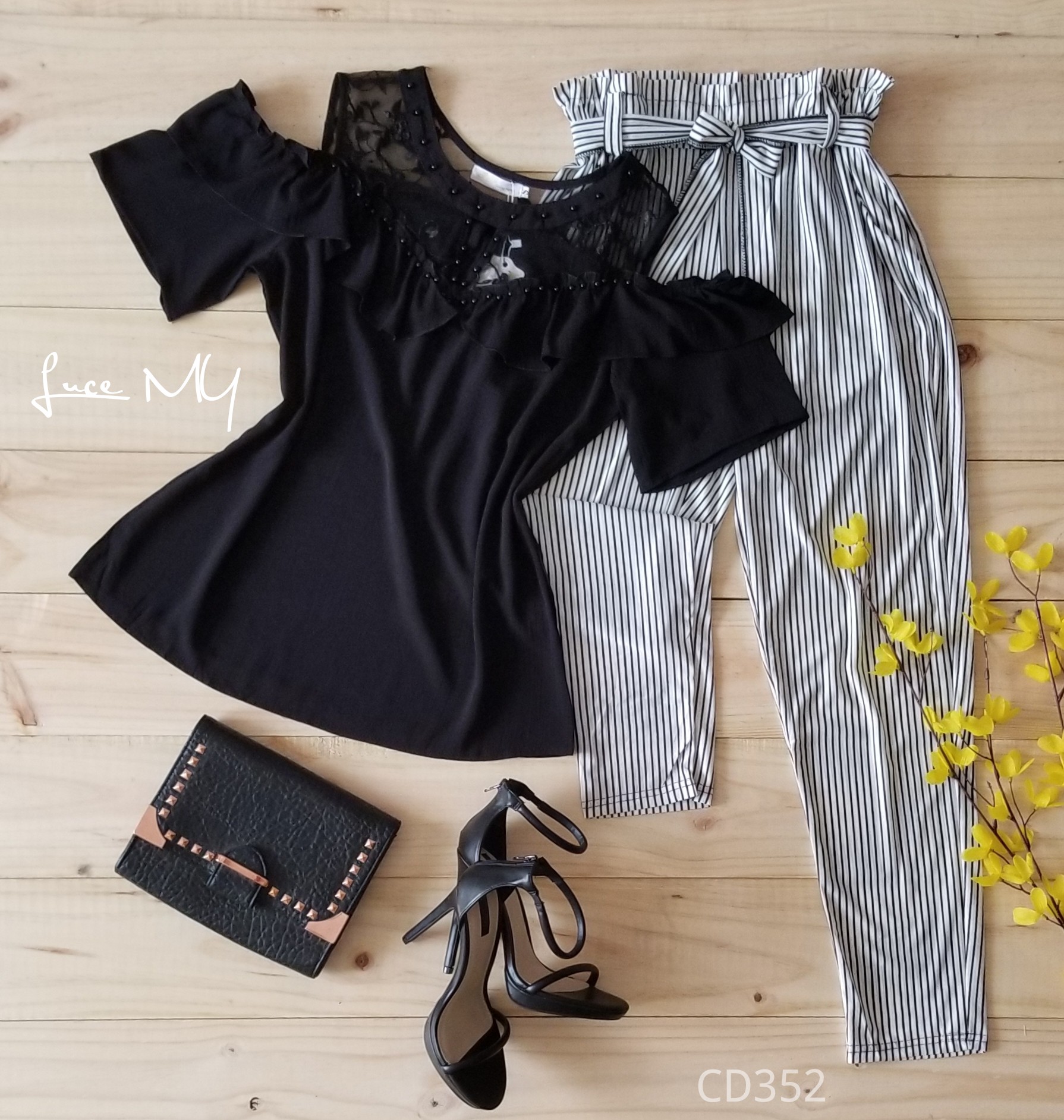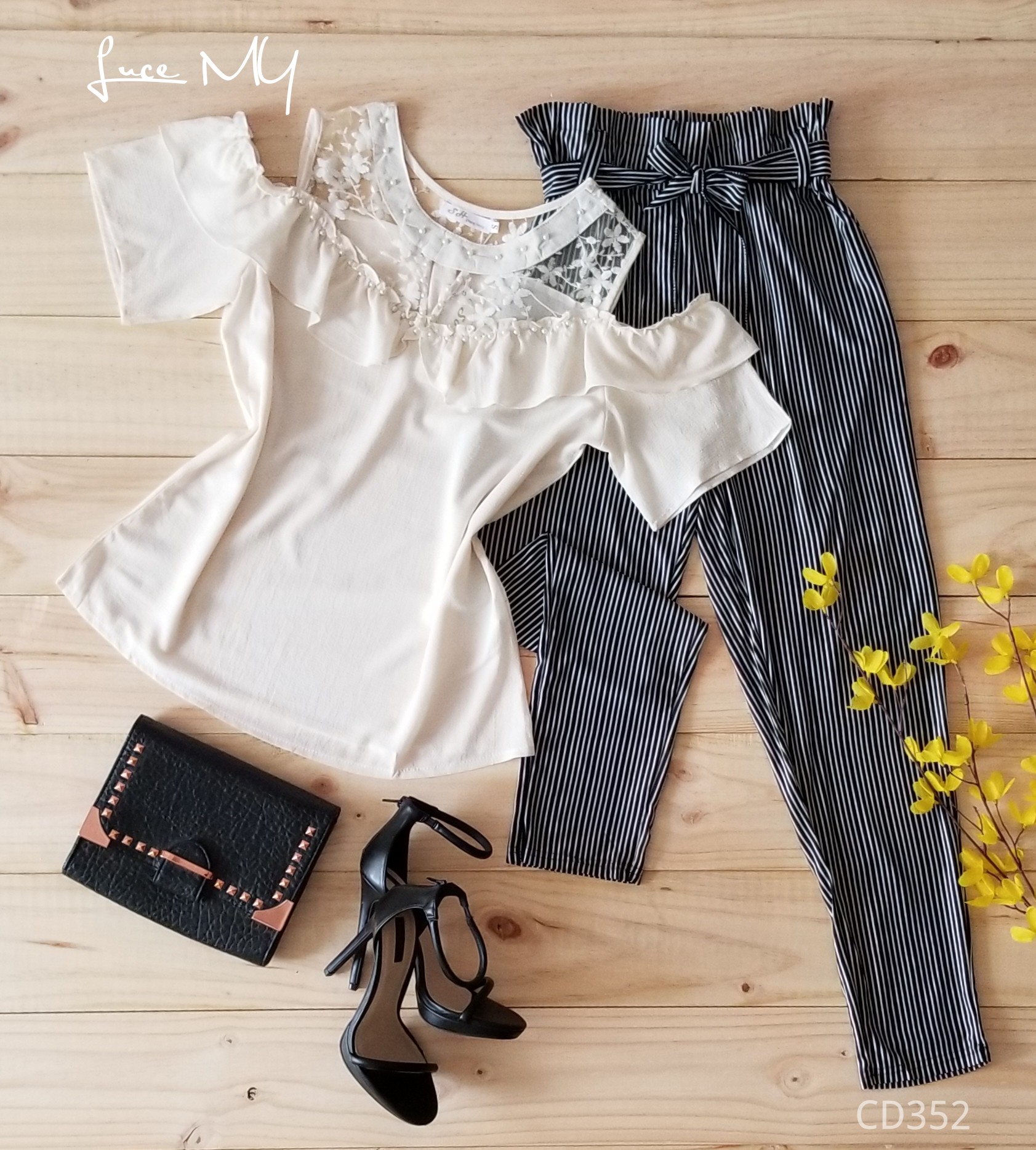 Descripción: Blusa ilusión con perlas, media manga contraste de encaje, hombros descubiertos. pantalón de líneas tela poliéster 90% y Spandex 10% Promoción Si llevas dos outfits a Q200.00
