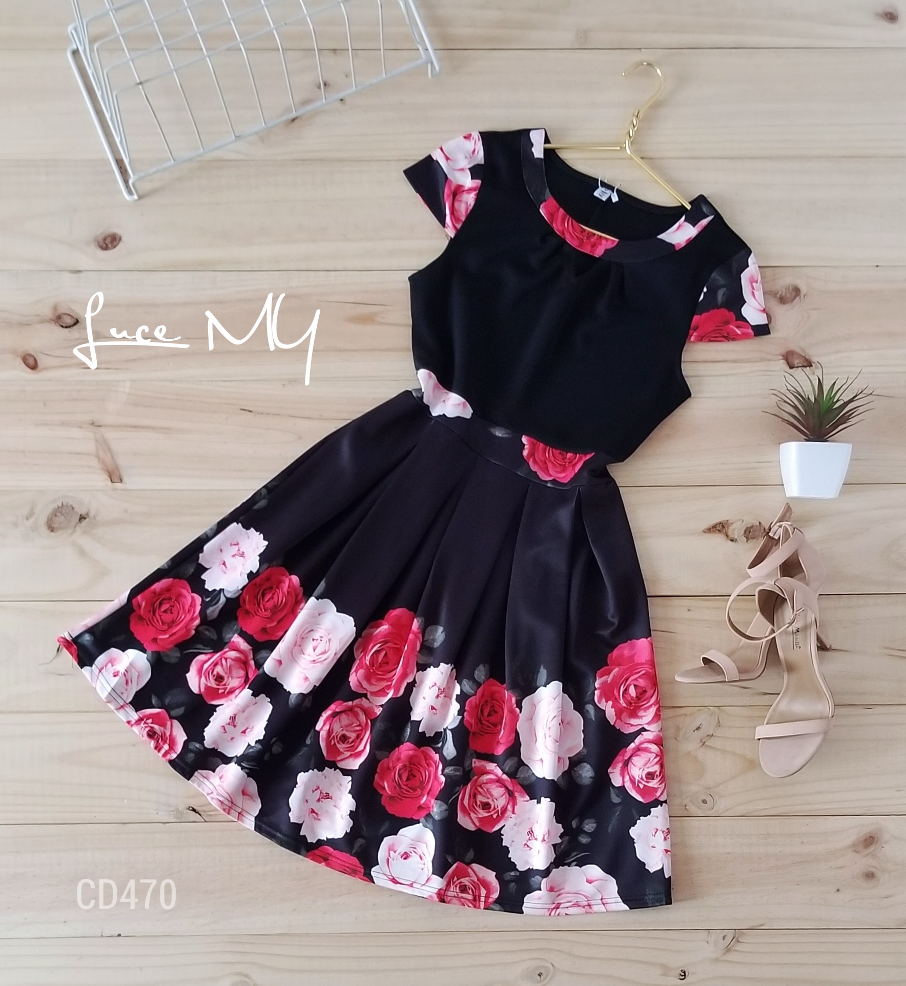 Descripción: Vestido evasé rosas, cuello redondo,en la parte de abajo es paletoneado