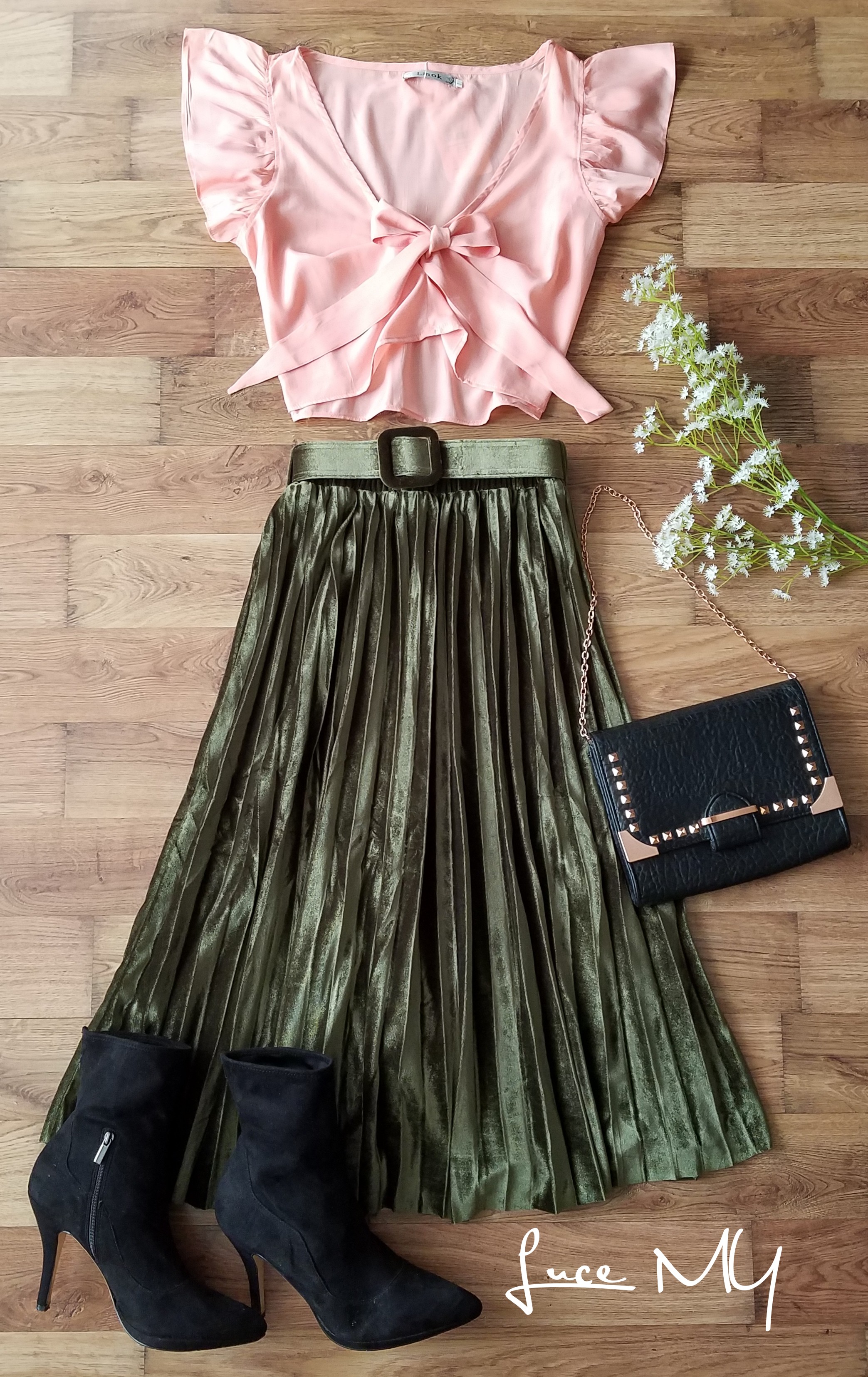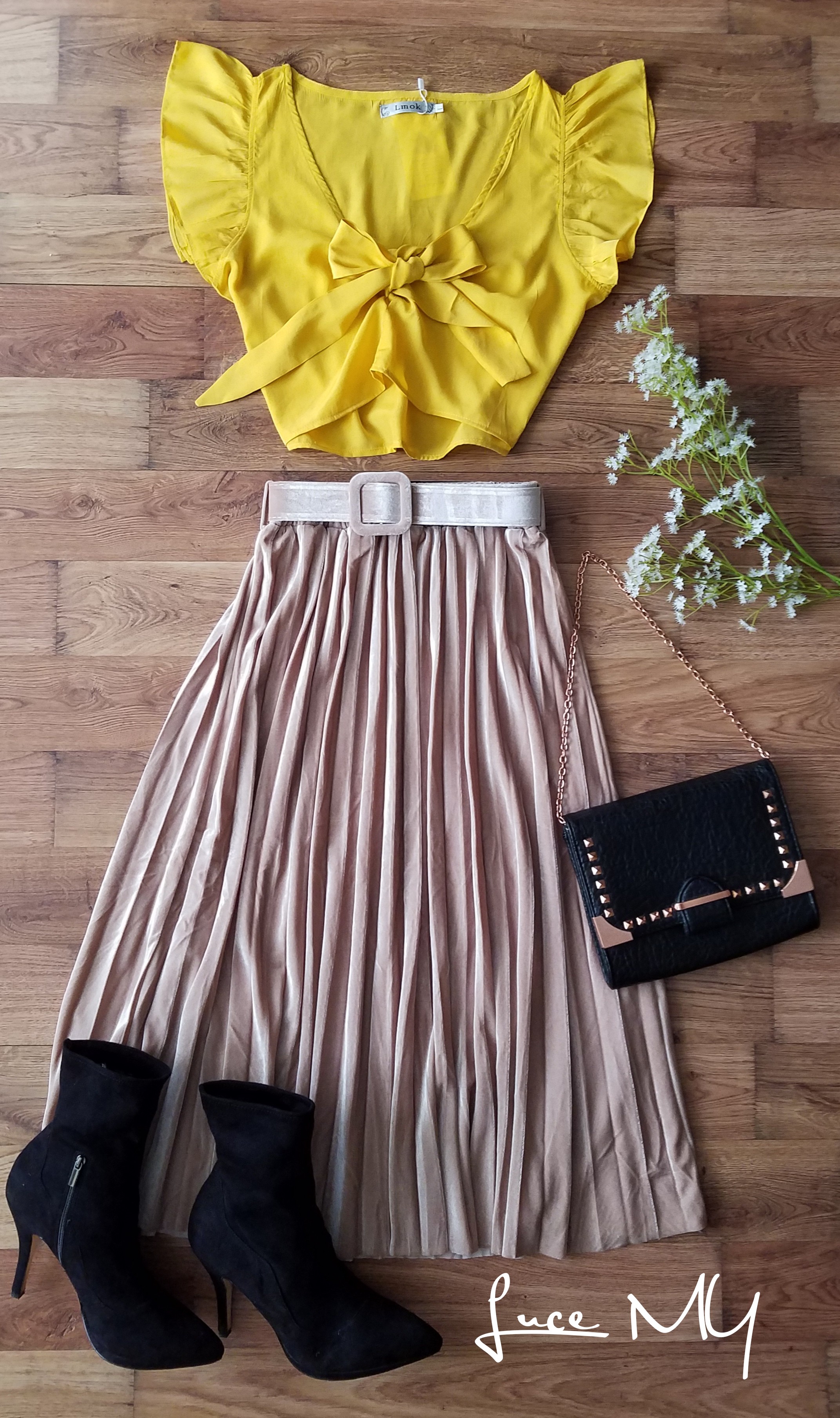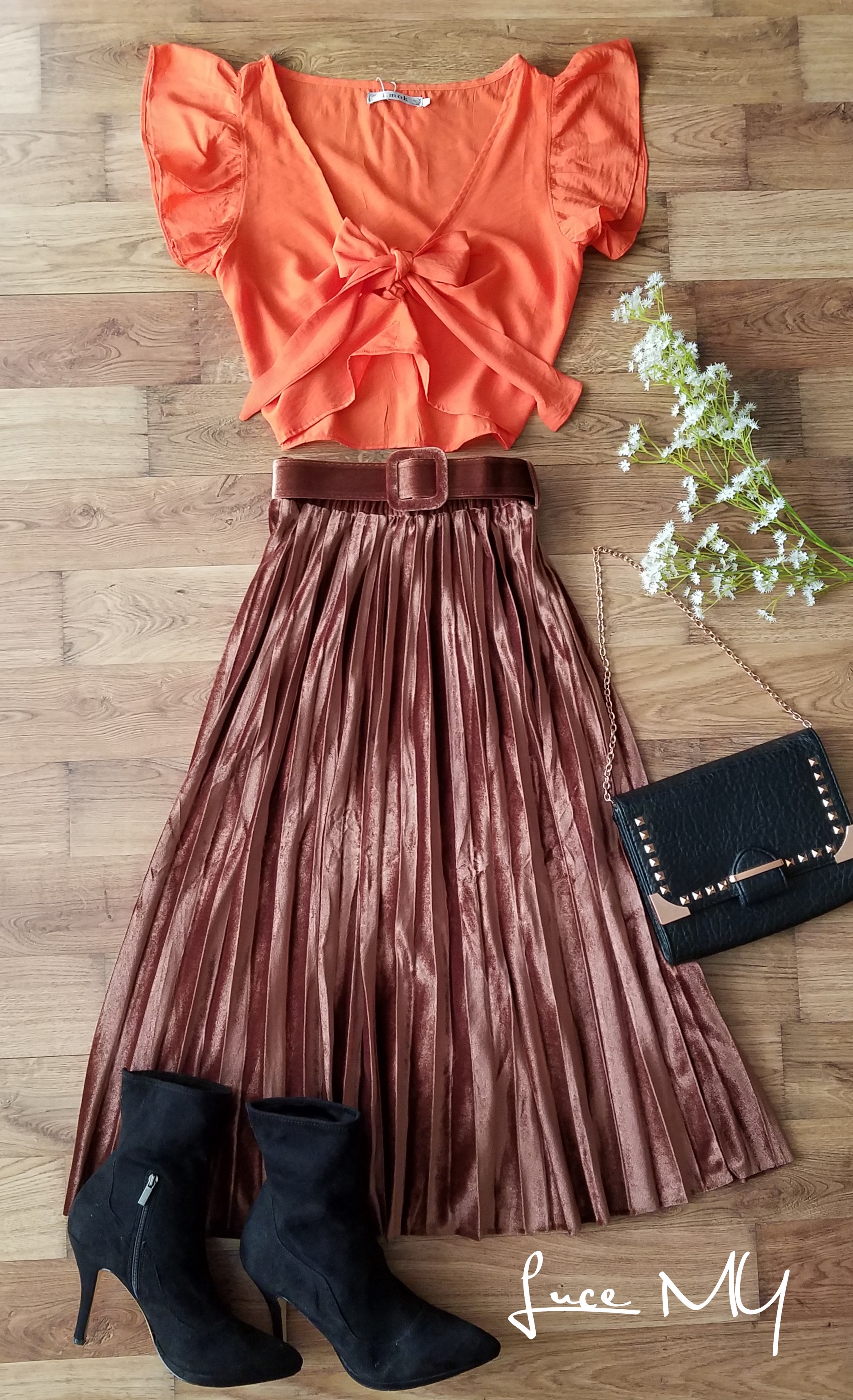 Descripción: Blusa corta con cordón delantero, material 65% poliéster y 35% algodón. Falda de Terciopelo plisadas, largo