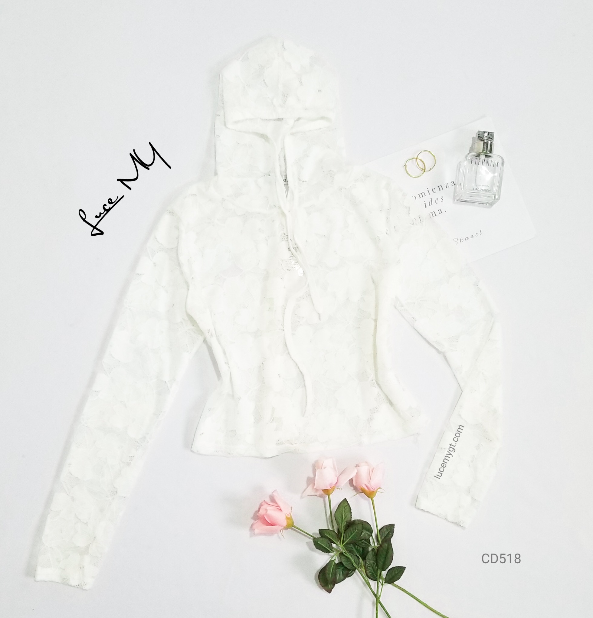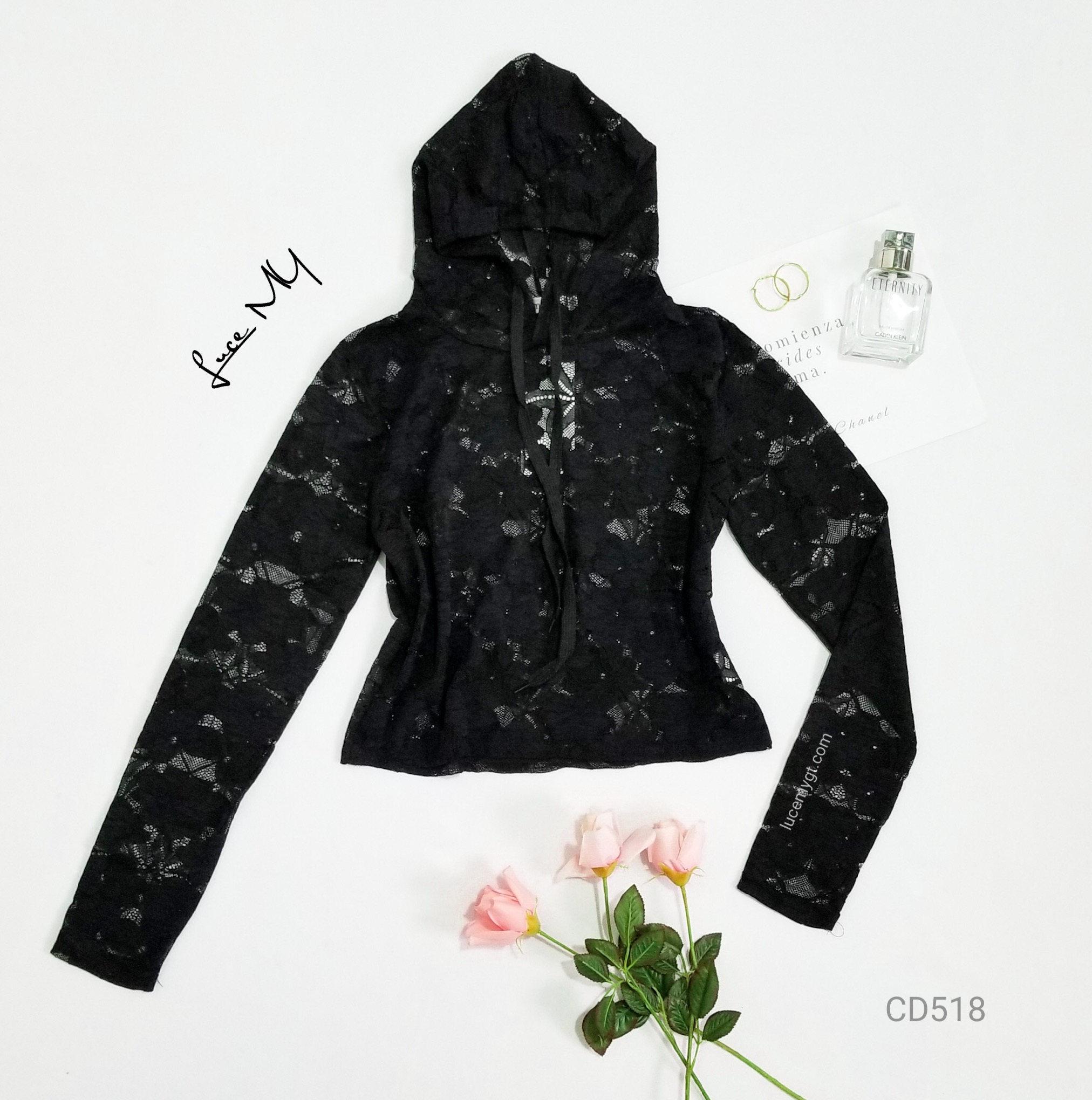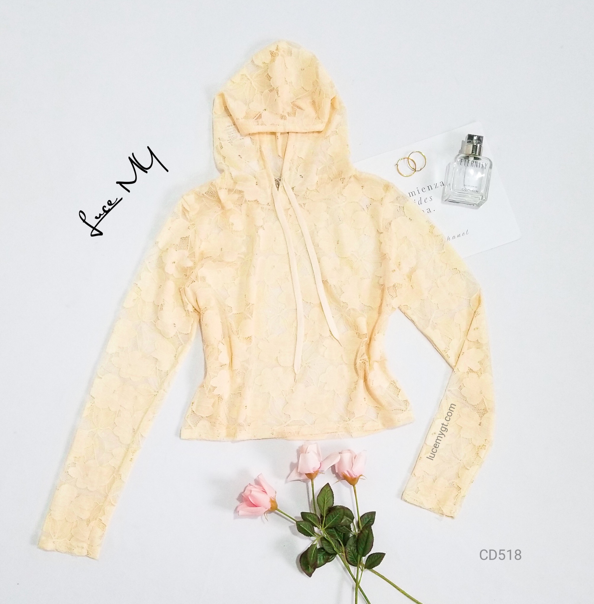 Descripción: Blusa con Capucha de encanje, agujeta ajustable, manga larga, material 65% poliéster y 35% algodón