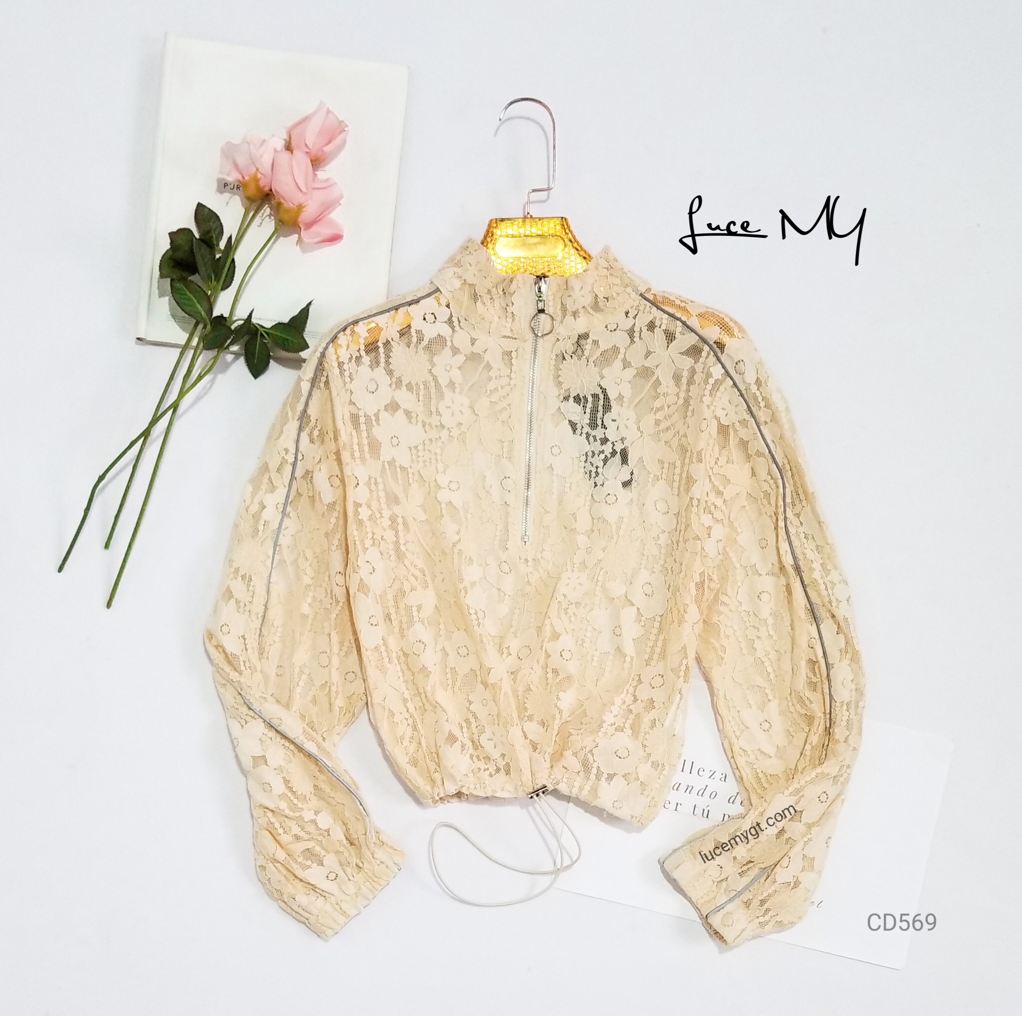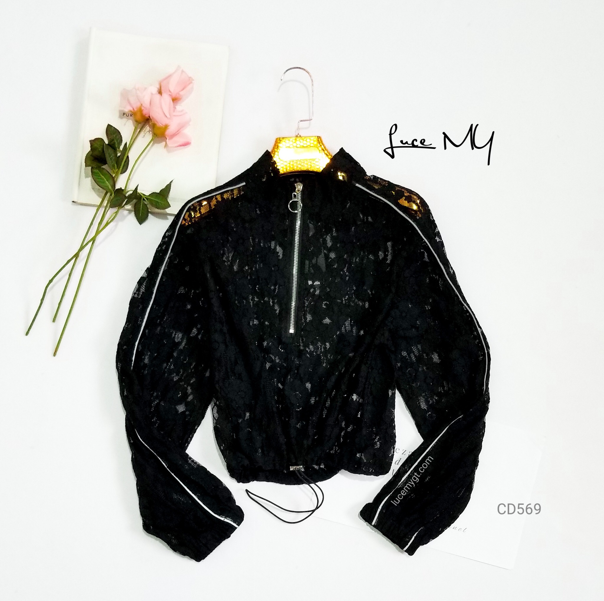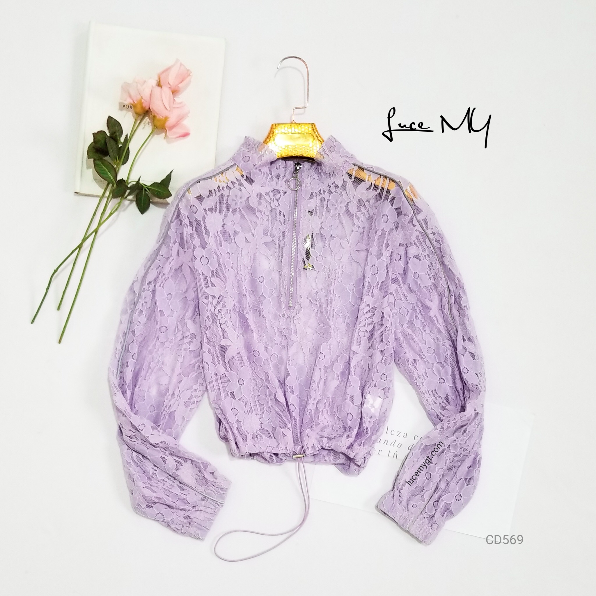 Descripción: Chumpa de encaje, cuello medio alto, zipper en la parte de enfrente, líneas reflectoras a los lados, elástico en las muñecas, ajustable en la cintura, materia 100% poliéster
