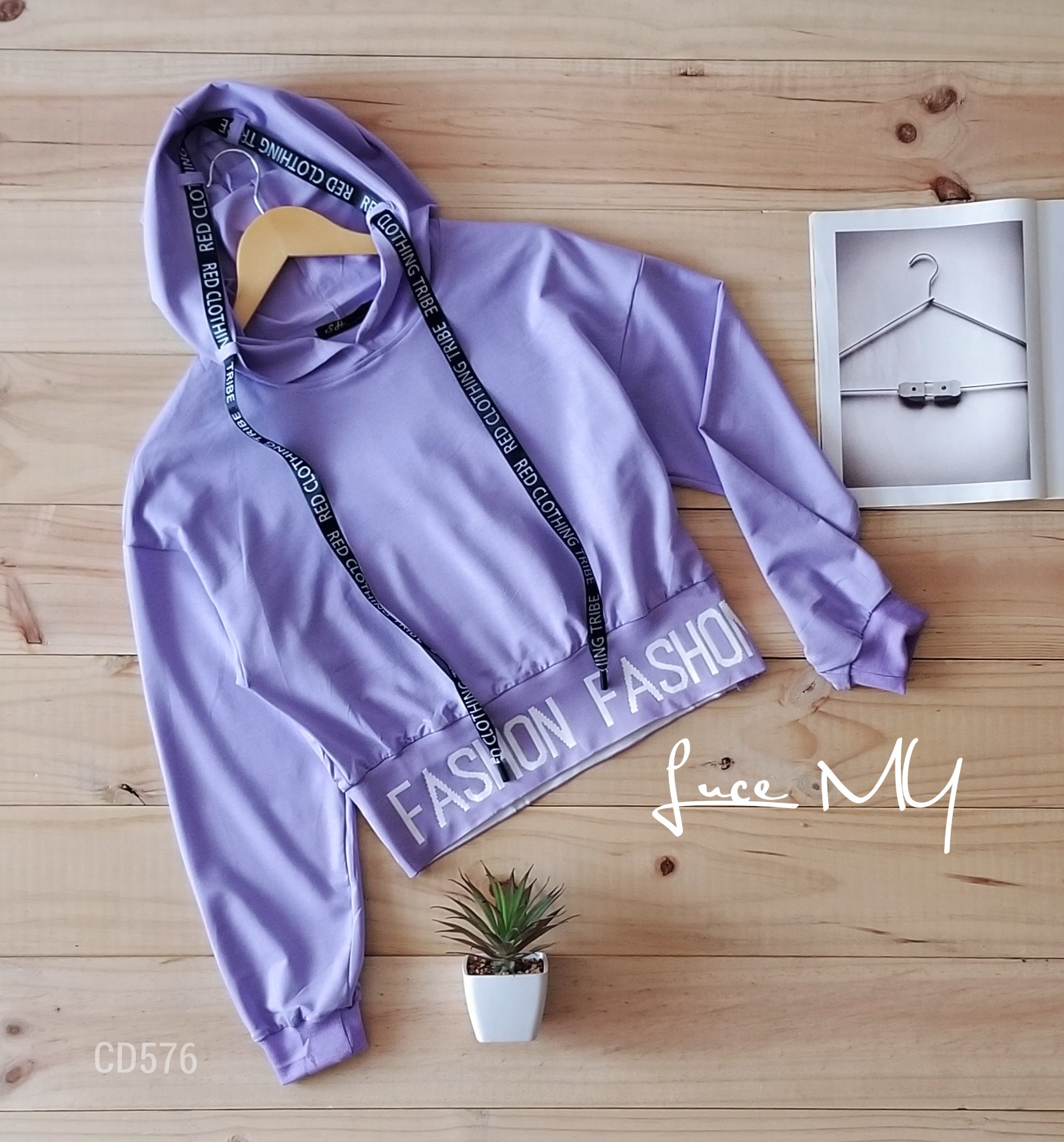 Descripción: Sudadera Fashion, con capucha cinta ajustable, hombros caídos manga larga, resorte en las mangas y cintura, material 100% poliéster.