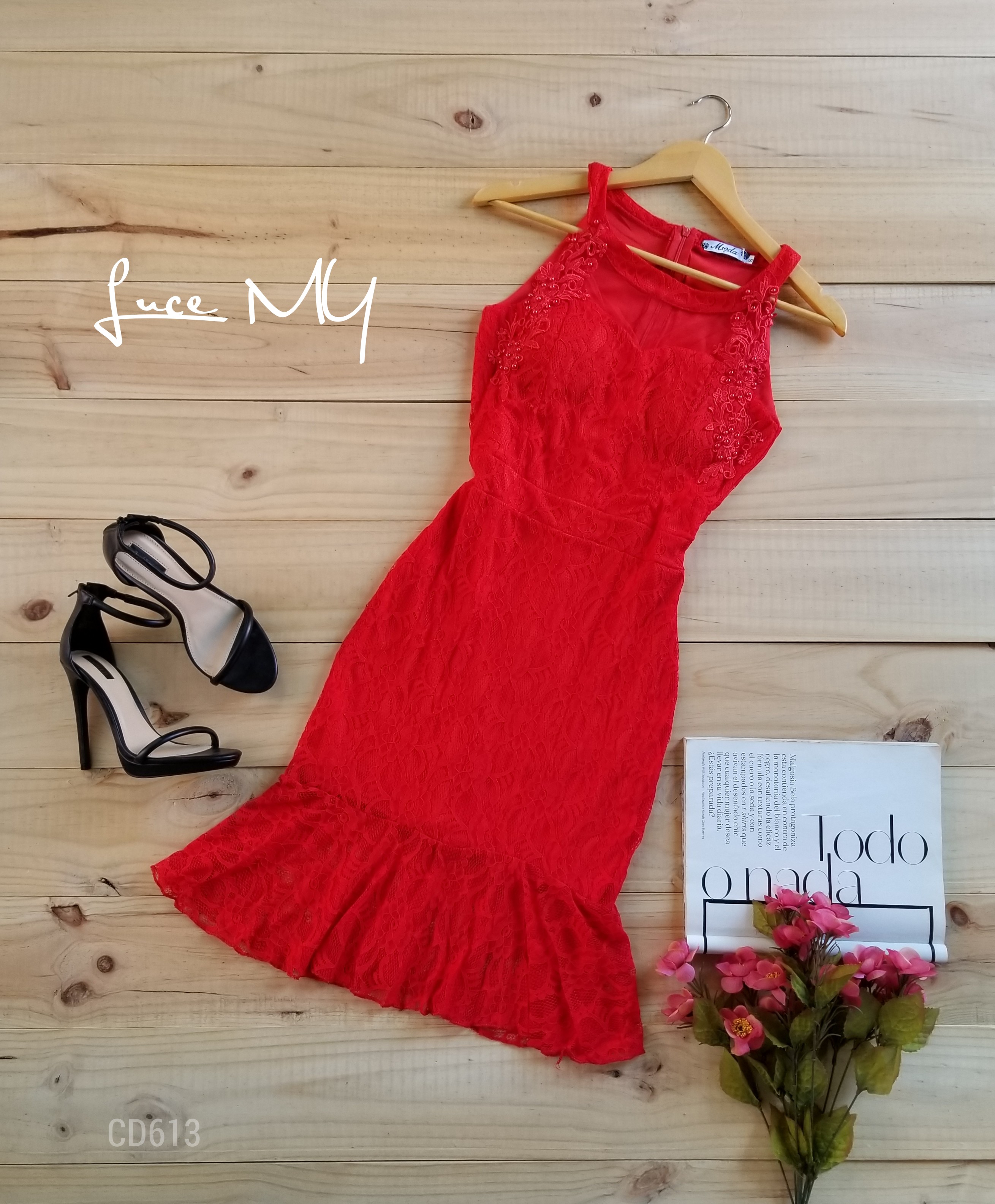 Descripción: Vestido Halter Tallado de Encaje, sin mangas, con vuelito en la parte de abajo y perlas en la parte de arriba, material 80% poliamida y 12% elastano