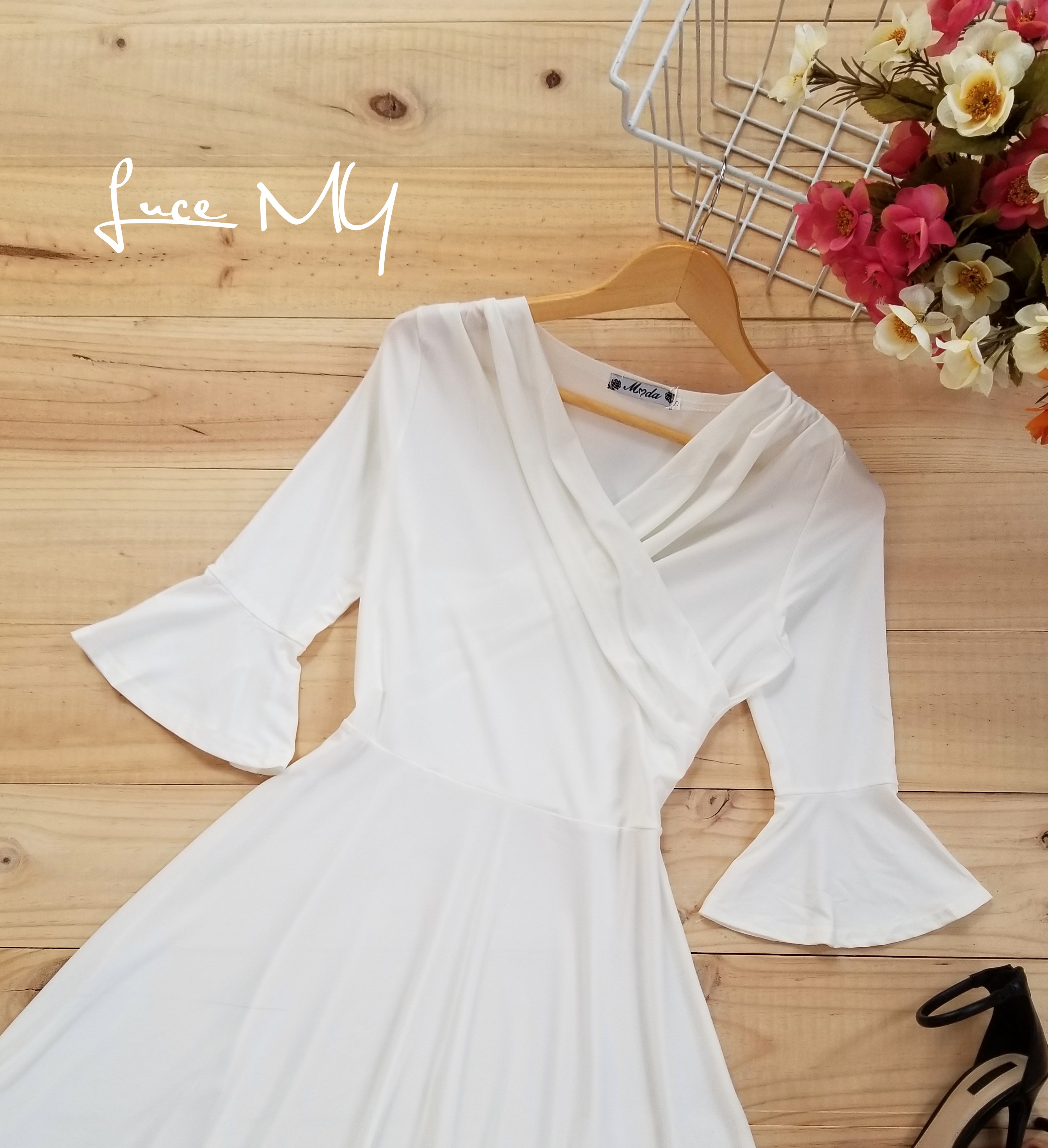 Descripción: Vestido Mangas Campana, cuello V traslape, material 95% poliéster y 5% elastano. Promoción Si llevas dos vestidos a solo por Q225.00