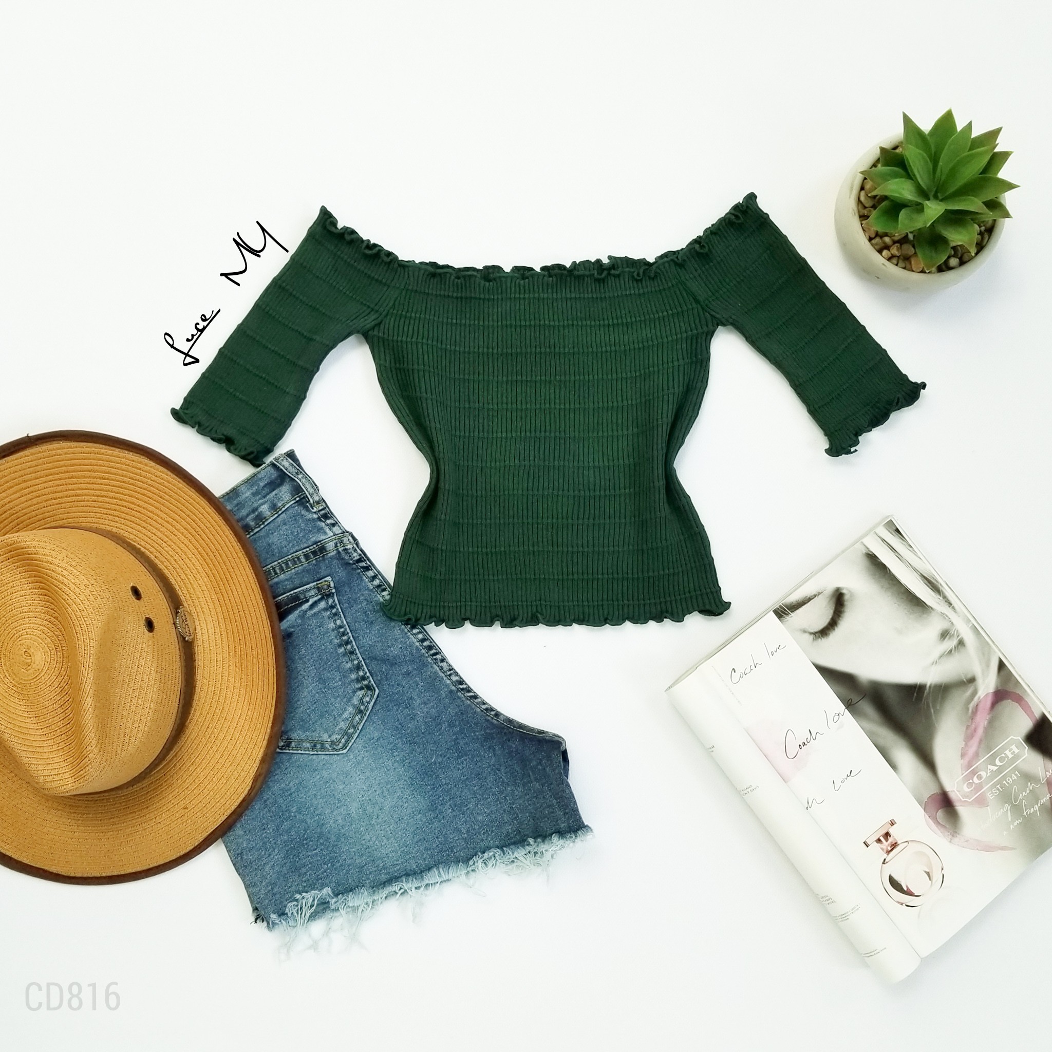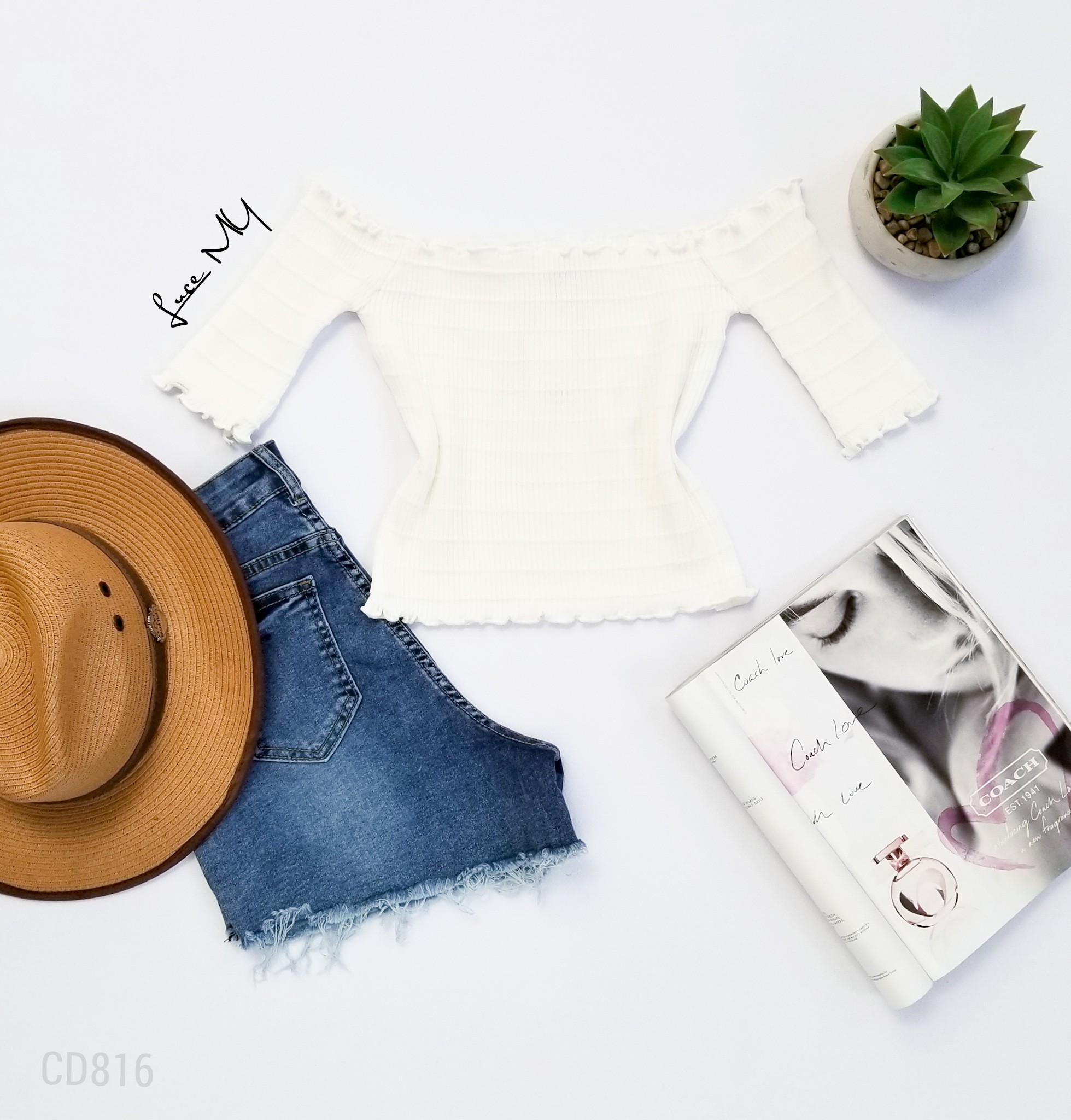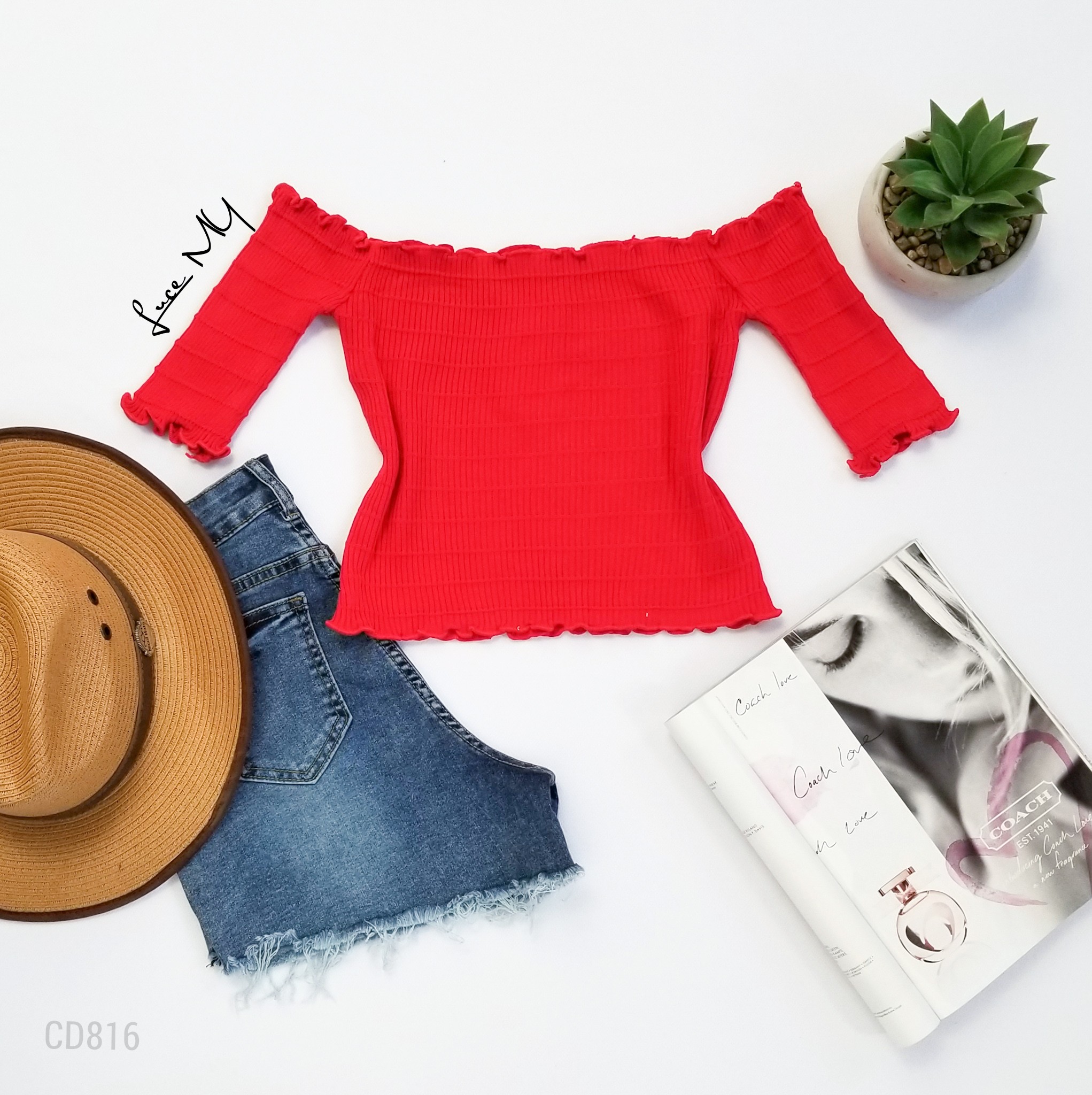 Descripción: Top Crop Off Shoulder, manga tres cuarto, orillas acaracolados, textura de tela acanalado. Promoción si llevas dos blusas a solo por Q135.00