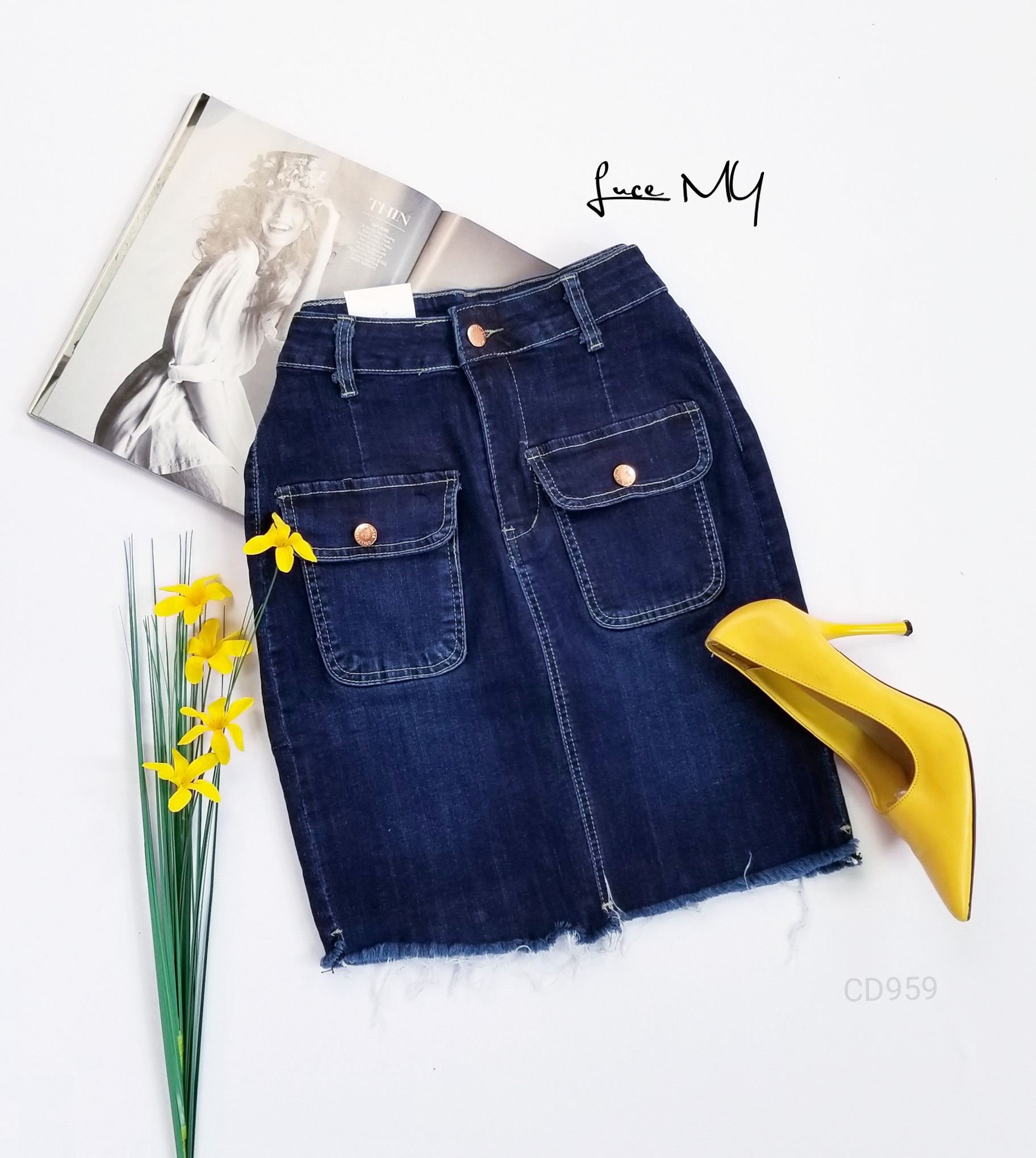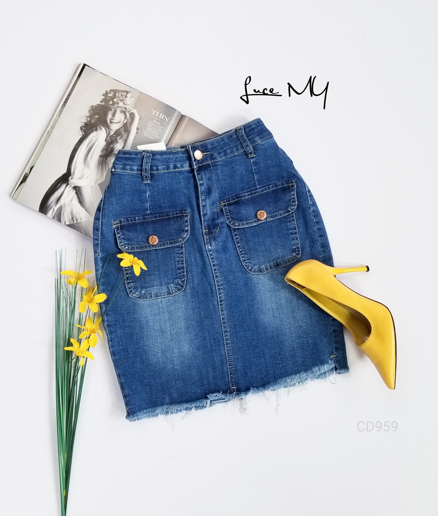 Descripción: Falda Vaquera, botón delantero y cremallera, bolsillo en la parte de adelante y atrás, material 90% algodón y 10% de poliéster