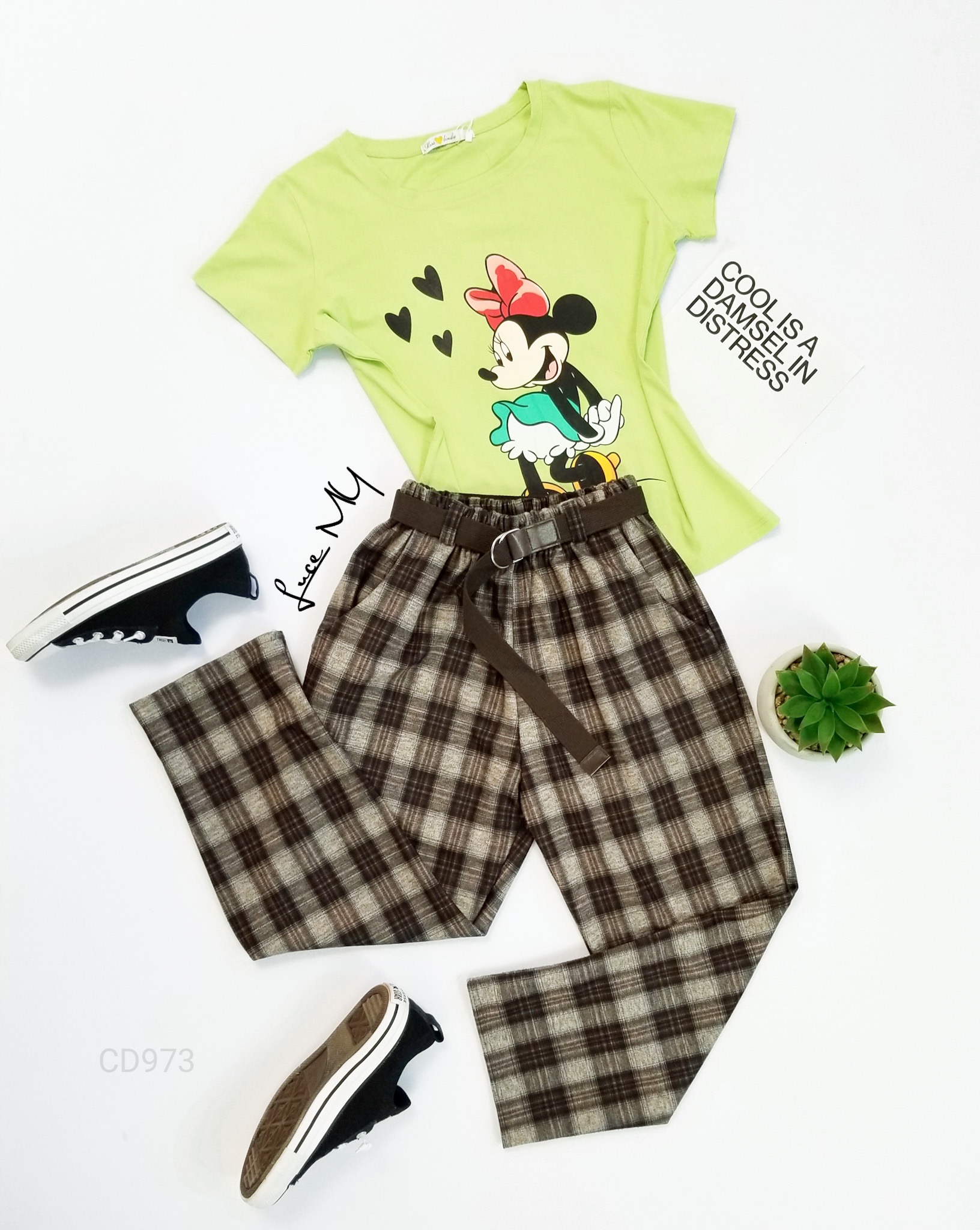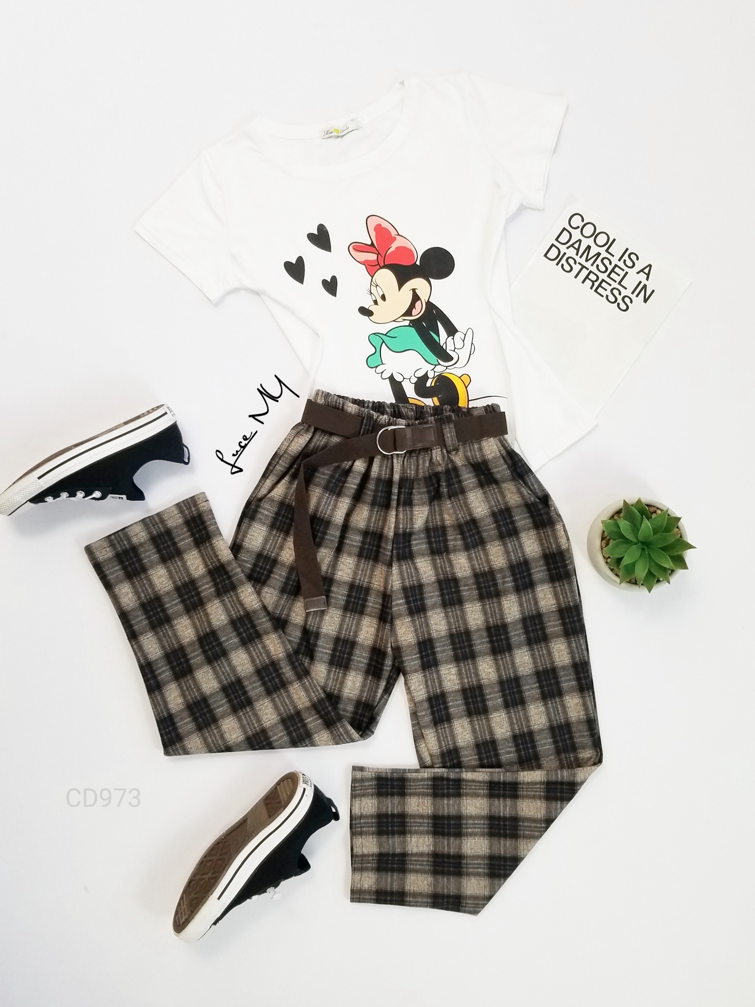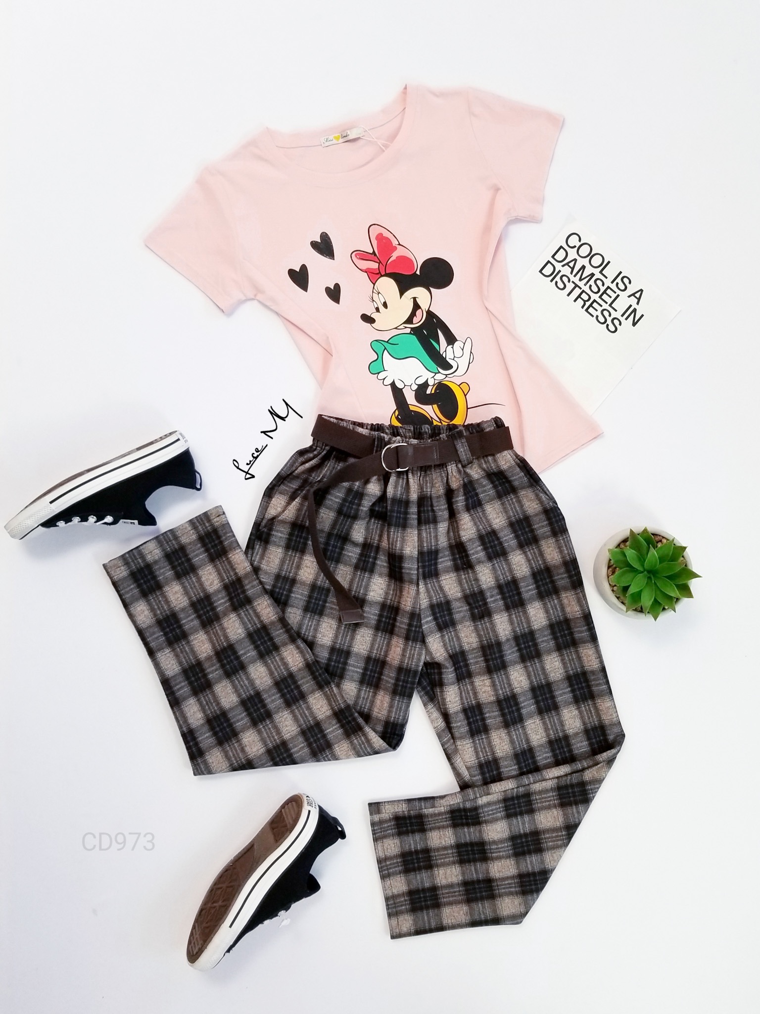 Descripción: T- Shirts Minnie, cuello redondo, manga corta, material 95% algodón y 5% de elastano. Pantalón Vintage, cintura alta con elástico, bolsillos a los lados incluye su cincho.